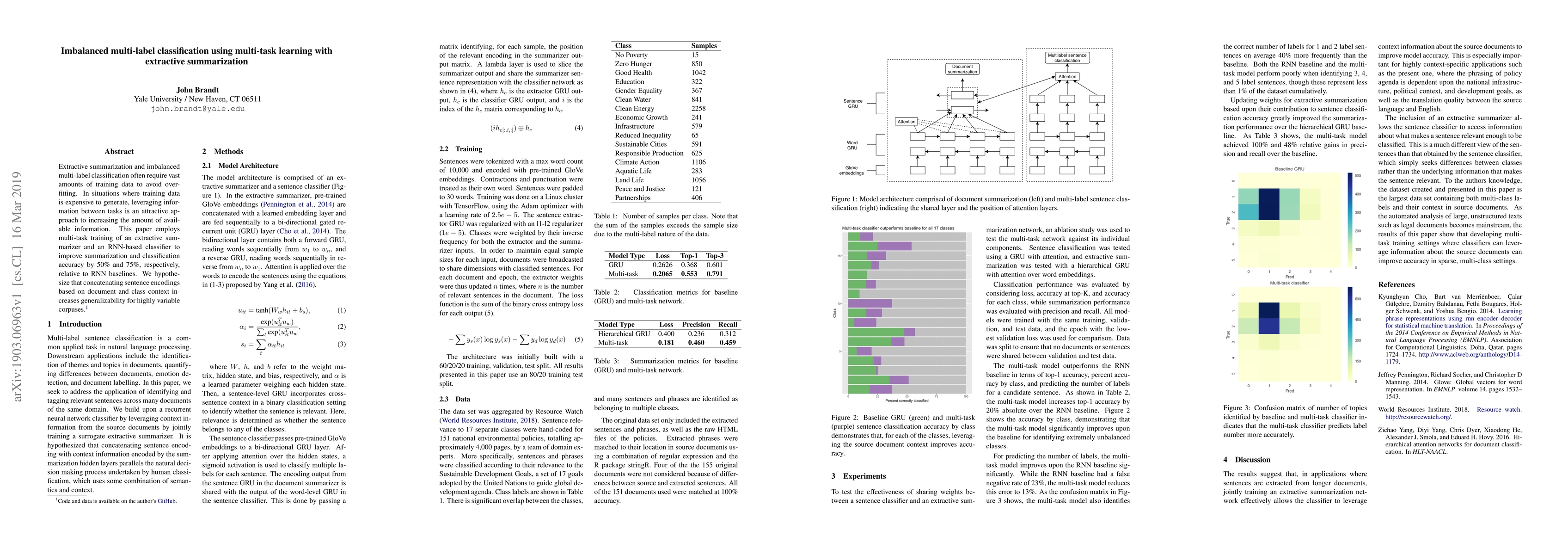 Extractive summarization and imbalanced multi-label classification often require vast amounts of training data to avoid overfitting. In situations where training data is expensive to generate, leveraging information between tasks is an attractive approach to increasing the amount of available information. This paper employs multi-task training of an extractive summarizer and an RNN-based classifier to improve summarization and classification accuracy by 50% and 75%, respectively, relative to RNN baselines. We hypothesize that concatenating sentence encodings based on document and class context increases generalizability for highly variable corpuses.