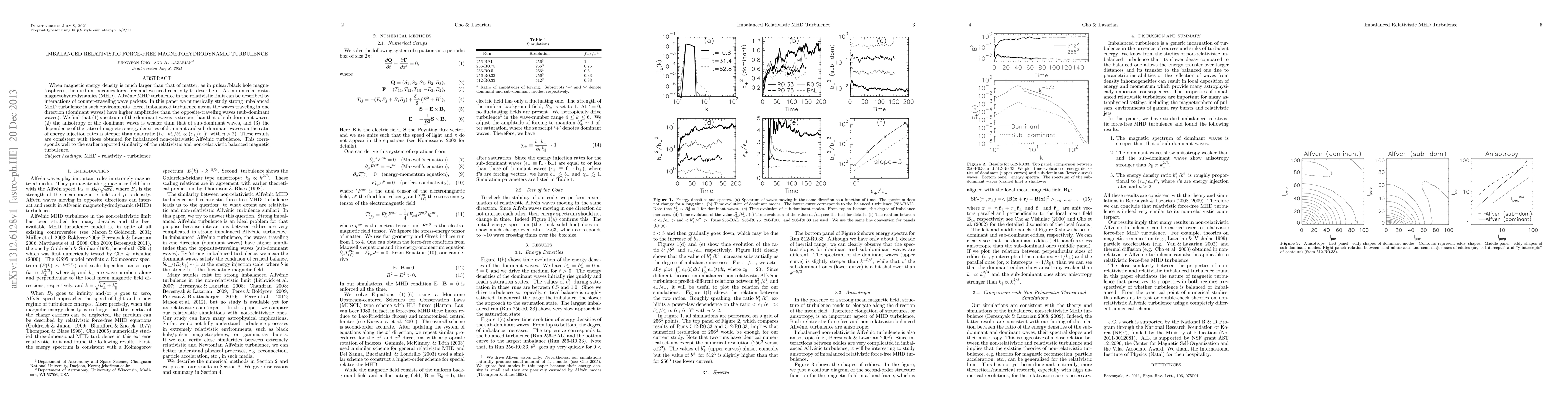 When magnetic energy density is much larger than that of matter, as in pulsar/black hole magnetospheres, the medium becomes force-free and we need relativity to describe it. As in non-relativistic magnetohydrodynamics (MHD), Alfv\'enic MHD turbulence in the relativistic limit can be described by interactions of counter-traveling wave packets. In this paper we numerically study strong imbalanced MHD turbulence in such environments. Here, imbalanced turbulence means the waves traveling in one direction (dominant waves) have higher amplitudes than the opposite-traveling waves (sub-dominant waves). We find that (1) spectrum of the dominant waves is steeper than that of sub-dominant waves, (2) the anisotropy of the dominant waves is weaker than that of sub-dominant waves, and (3) the dependence of the ratio of magnetic energy densities of dominant and sub-dominant waves on the ratio of energy injection rates is steeper than quadratic (i.e., \$b_+^2/b_-^2 \propto (\epsilon_+/\epsilon_-)^n \$ with n>2). These results are consistent with those obtained for imbalanced non-relativistic Alfv\'enic turbulence. This corresponds well to the earlier reported similarity of the relativistic and non-relativistic balanced magnetic turbulence.