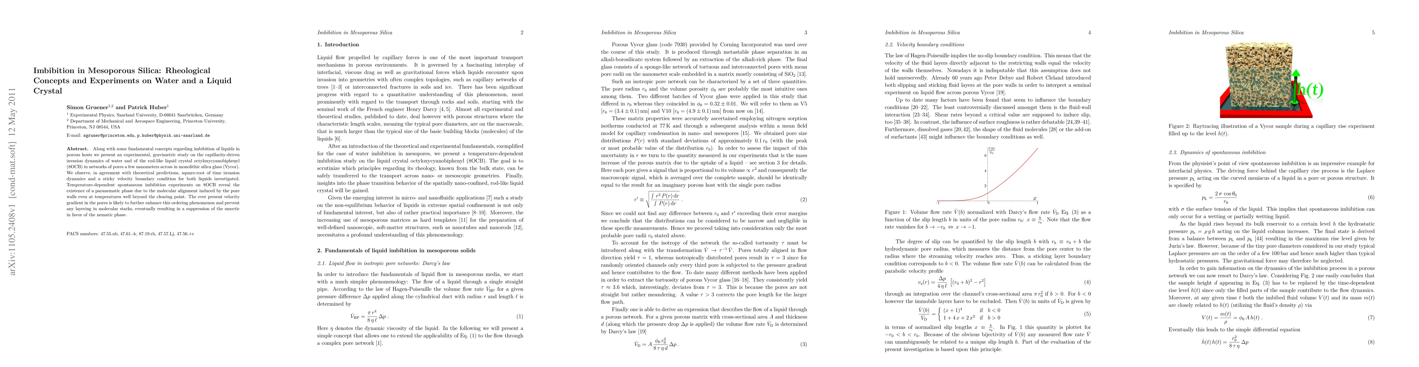 This paper explores the imbibition dynamics of water and a liquid crystal in mesoporous silica, observing square root of time invasion and a sticky boundary condition, and identifies a paranematic phase in the liquid crystal due to molecular alignment in the pores, which suppresses the smectic phase.