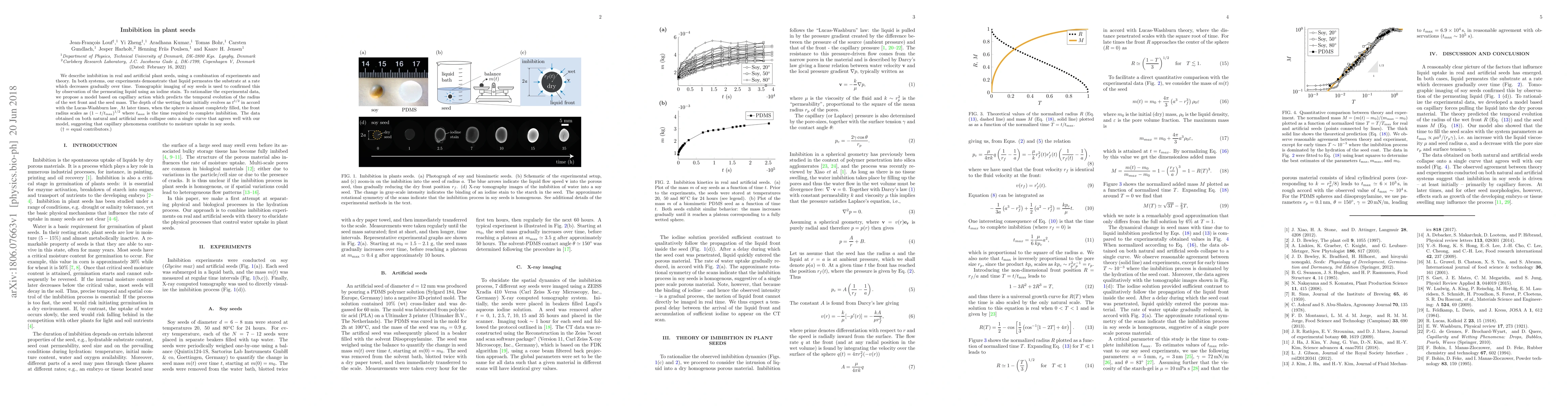We describe imbibition in real and artificial plant seeds, using a combination of experiments and theory. In both systems, our experiments demonstrate that liquid permeates the substrate at a rate which decreases gradually over time. Tomographic imaging of soy seeds is used to confirmed this by observation of the permeating liquid using an iodine stain. To rationalize the experimental data, we propose a model based on capillary action which predicts the temporal evolution of the radius of the wet front and the seed mass. The depth of the wetting front initially evolves as $t^{1/2}$ in accord with the Lucas-Washburn law. At later times, when the sphere is almost completely filled, the front radius scales as $(1-t/t_{\text{max}})^{1/2}$ where $t_{\text{max}}$ is the time required to complete imbibition. The data obtained on both natural and artificial seeds collapse onto a single curve that agrees well with our model, suggesting that capillary phenomena contribute to moisture uptake in soy seeds.