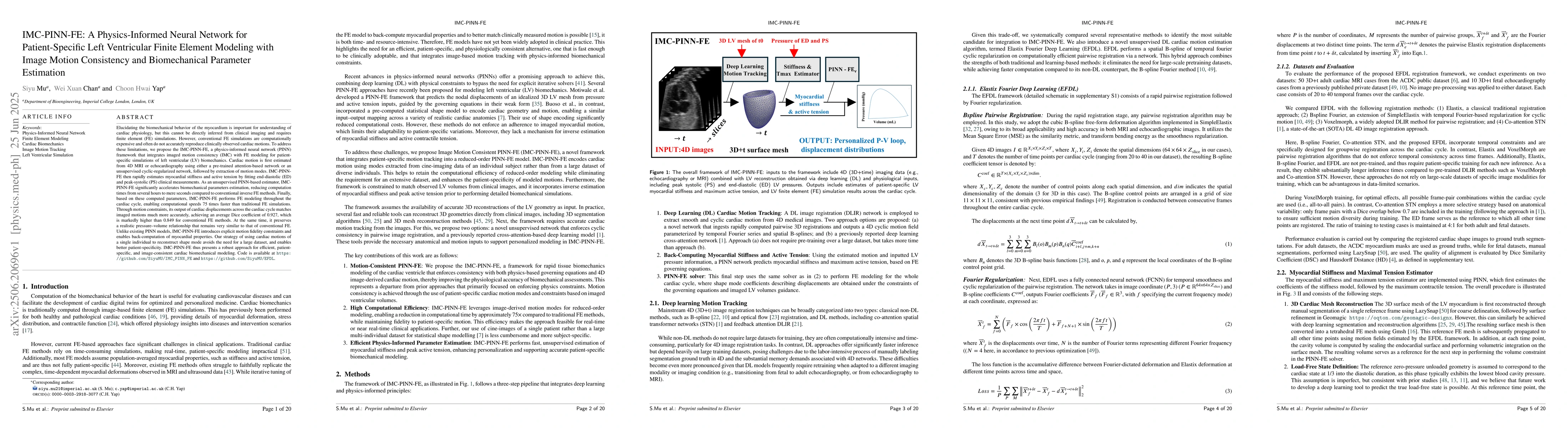 Elucidating the biomechanical behavior of the myocardium is crucial for understanding cardiac physiology, but cannot be directly inferred from clinical imaging and typically requires finite element (FE) simulations. However, conventional FE methods are computationally expensive and often fail to reproduce observed cardiac motions. We propose IMC-PINN-FE, a physics-informed neural network (PINN) framework that integrates imaged motion consistency (IMC) with FE modeling for patient-specific left ventricular (LV) biomechanics. Cardiac motion is first estimated from MRI or echocardiography using either a pre-trained attention-based network or an unsupervised cyclic-regularized network, followed by extraction of motion modes. IMC-PINN-FE then rapidly estimates myocardial stiffness and active tension by fitting clinical pressure measurements, accelerating computation from hours to seconds compared to traditional inverse FE. Based on these parameters, it performs FE modeling across the cardiac cycle at 75x speedup. Through motion constraints, it matches imaged displacements more accurately, improving average Dice from 0.849 to 0.927, while preserving realistic pressure-volume behavior. IMC-PINN-FE advances previous PINN-FE models by introducing back-computation of material properties and better motion fidelity. Using motion from a single subject to reconstruct shape modes also avoids the need for large datasets and improves patient specificity. IMC-PINN-FE offers a robust and efficient approach for rapid, personalized, and image-consistent cardiac biomechanical modeling.
