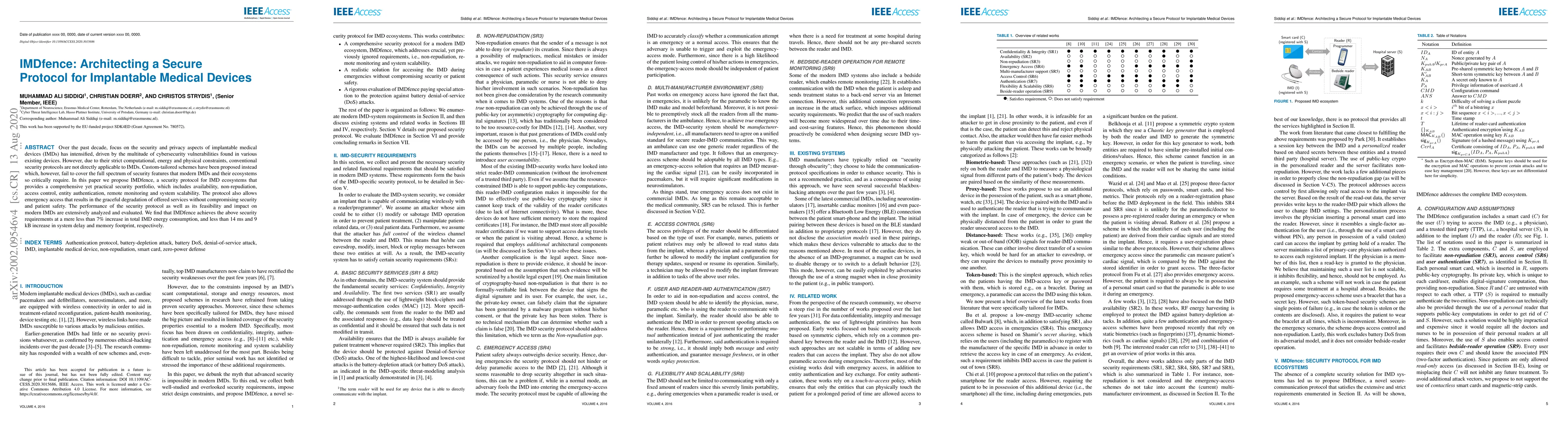 IMDfence proposes a secure protocol for implantable medical devices (IMDs) that addresses their unique security needs while ensuring minimal impact on energy, delay, and memory. The protocol achieves comprehensive security features with only a slight increase in resource usage.