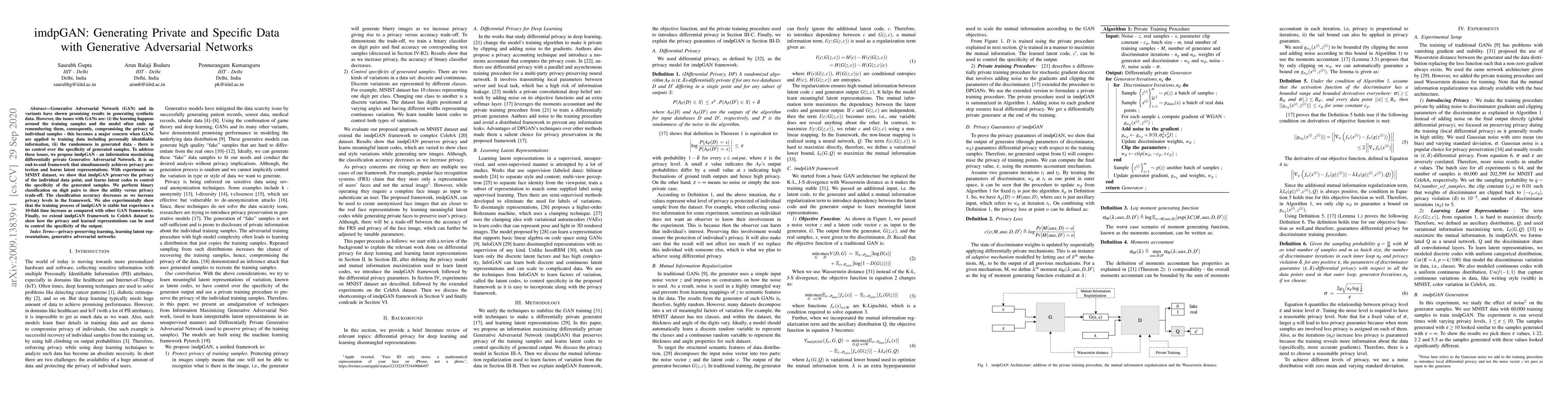 imdpGAN proposes a differentially private GAN that protects individual data privacy and controls the specificity of generated samples. Experiments on MNIST and CelebA datasets demonstrate its effectiveness in balancing privacy and utility, though with a significant increase in training time.