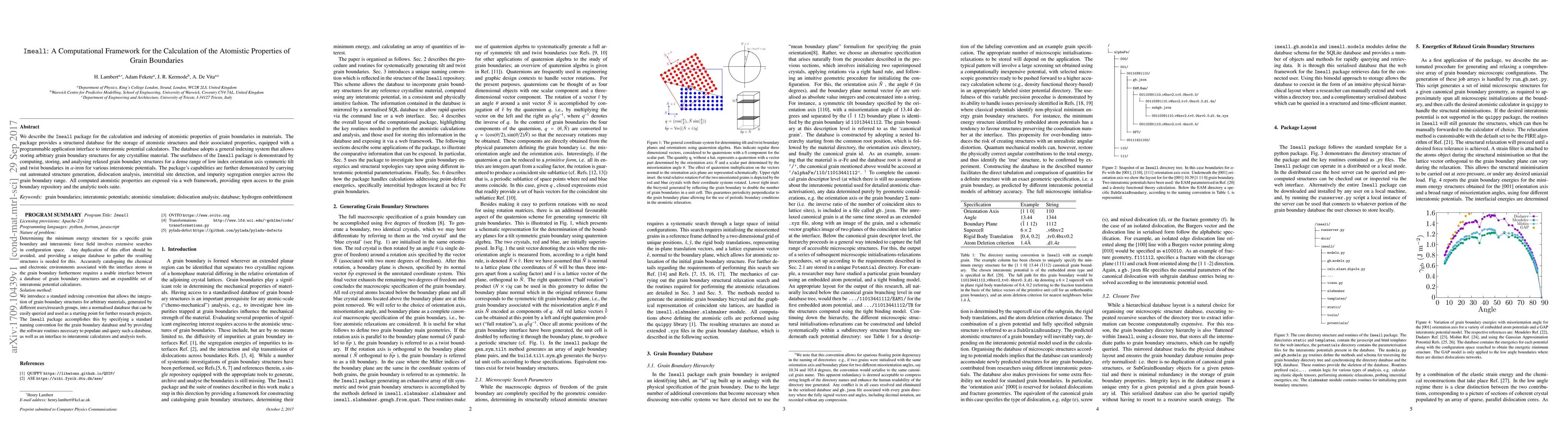 We describe the \texttt{Imeall} package for the calculation and indexing of atomistic properties of grain boundaries in materials. The package provides a structured database for the storage of atomistic structures and their associated properties, equipped with a programmable application interface to interatomic potential calculators. The database adopts a general indexing system that allows storing arbitrary grain boundary structures for any crystalline material. The usefulness of the \texttt{Imeall} package is demonstrated by computing, storing, and analysing relaxed grain boundary structures for a dense range of low index orientation axis symmetric tilt and twist boundaries in $\alpha$-iron for various interatomic potentials. The package's capabilities are further demonstrated by carrying out automated structure generation, dislocation analysis, interstitial site detection, and impurity segregation energies across the grain boundary range. All computed atomistic properties are exposed via a web framework, providing open access to the grain boundary repository and the analytic tools suite.