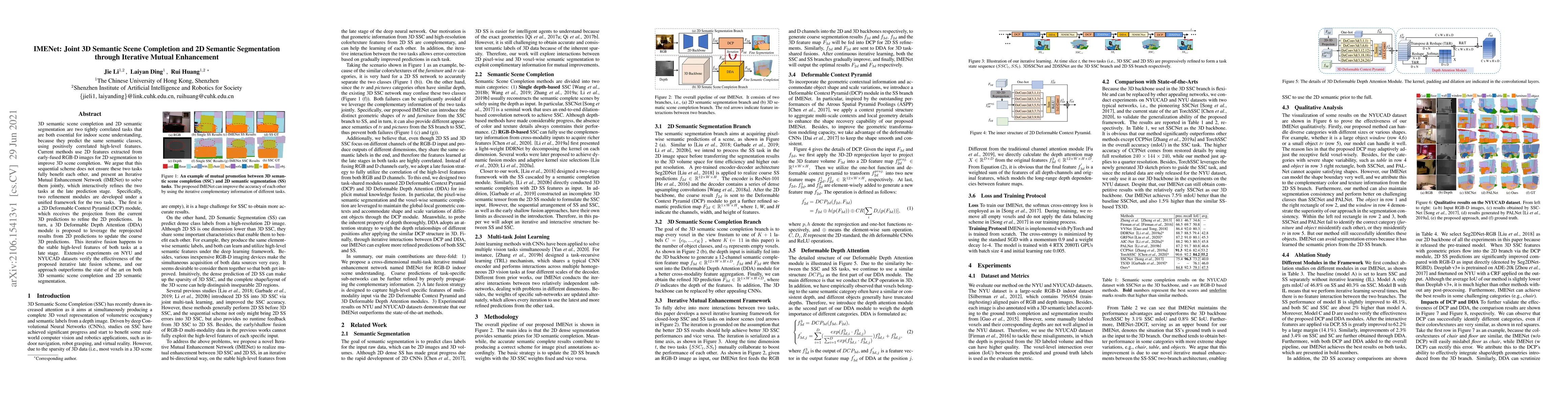 IMENet proposes an iterative mutual enhancement framework to jointly solve 3D semantic scene completion and 2D semantic segmentation, leveraging late-stage refinement modules to interactively refine both tasks. The approach outperforms existing methods on NYU and NYUCAD datasets.