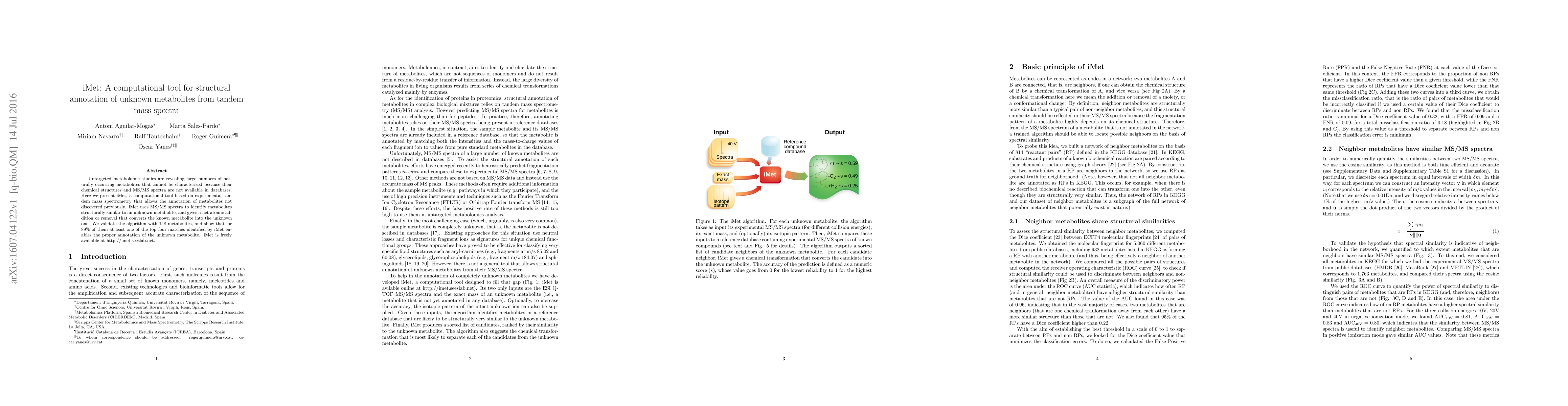 Untargeted metabolomic studies are revealing large numbers of naturally occurring metabolites that cannot be characterized because their chemical structures and MS/MS spectra are not available in databases. Here we present iMet, a computational tool based on experimental tandem mass spectrometry that could potentially allow the annotation of metabolites not discovered previously. iMet uses MS/MS spectra to identify metabolites structurally similar to an unknown metabolite, and gives a net atomic addition or removal that converts the known metabolite into the unknown one. We validate the algorithm with 148 metabolites, and show that for 89% of them at least one of the top four matches identified by iMet enables the proper annotation of the unknown metabolite. iMet is freely available at http://imet.seeslab.net.