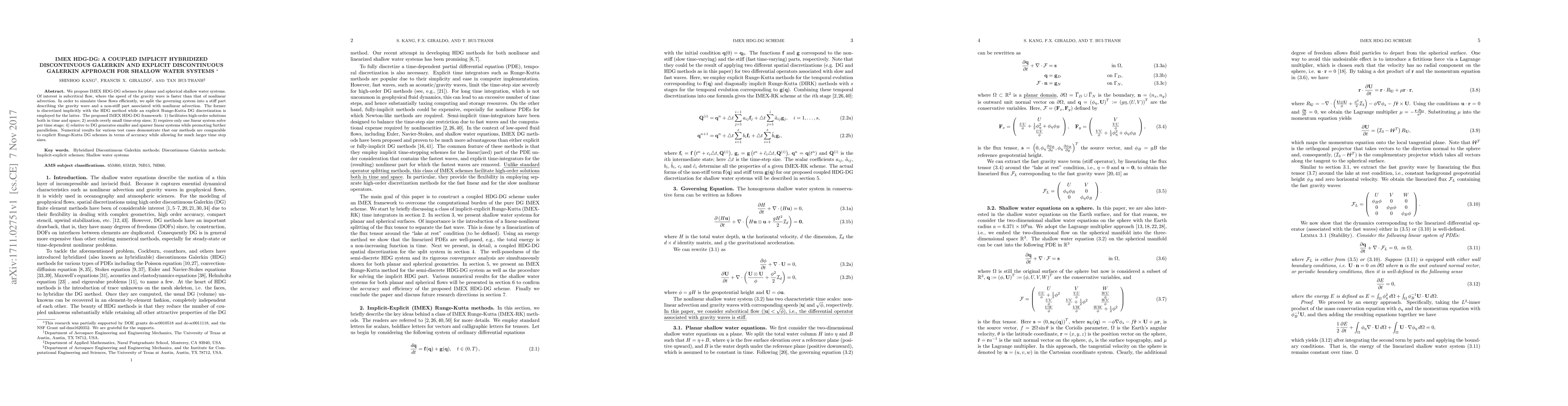The paper proposes a new numerical method for simulating shallow water systems that combines implicit and explicit methods to efficiently solve stiff and non-stiff equations simultaneously, enabling larger time step sizes and comparable accuracy to existing schemes.