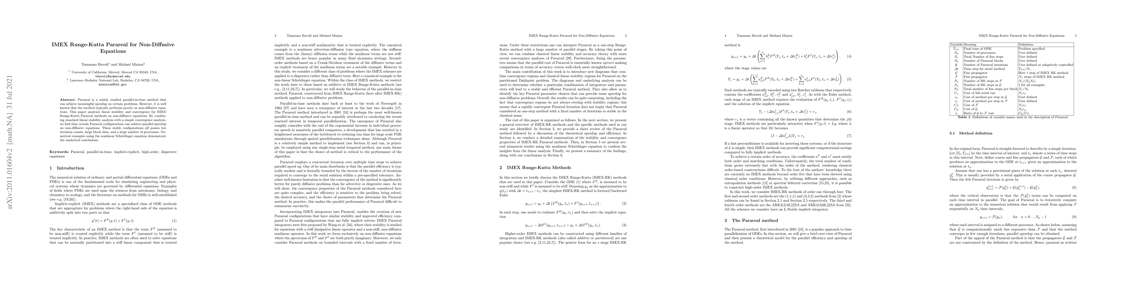 This paper explores the application of IMEX Runge-Kutta Parareal methods to non-diffusive equations, finding that specific configurations can achieve parallel speedup despite typical performance issues. Numerical results using the nonlinear Schrodinger equation validate the analytical findings.
