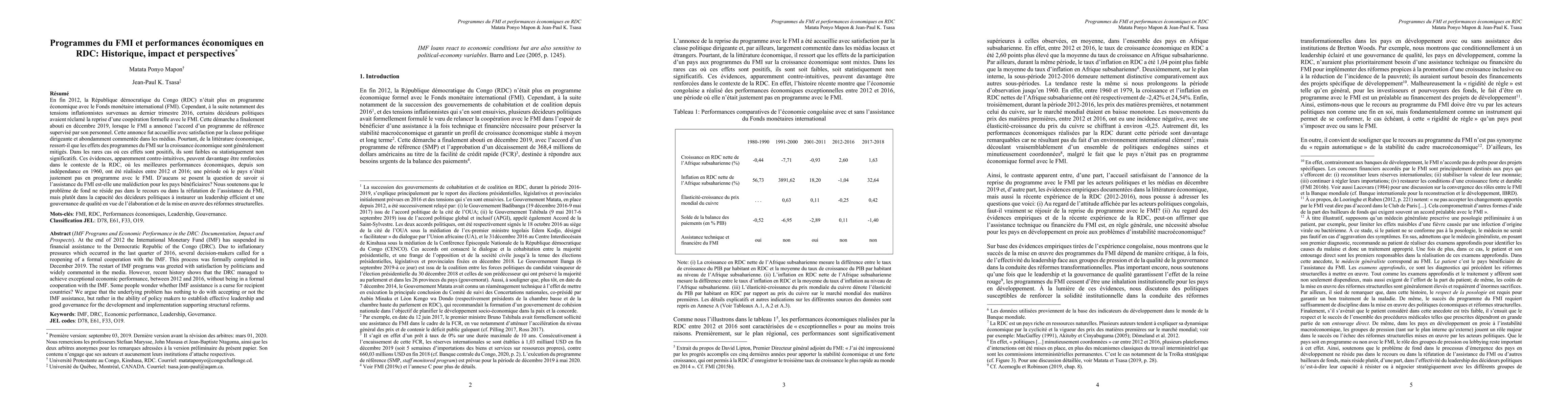 At the end of 2012 the International Monetary Fund (IMF) has suspended its financial assistance to the Democratic Republic of the Congo (DRC). Due to inflationary pressures which occurred in the last quarter of 2016, several decision-makers called for a reopening of a formal cooperation with the IMF. This process was formally completed in December 2019. The restart of IMF programs was greeted with satisfaction by politicians and widely commented in the media. However, recent history shows that the DRC managed to achieve exceptional economic performance, between 2012 and 2016, without being in a formal cooperation with the IMF. Some people wonder whether IMF assistance is a curse for recipient countries? We argue that the underlying problem has nothing to do with accepting or not the IMF assistance, but rather in the ability of policy makers to establish effective leadership and good governance for the development and implementation supporting structural reforms.