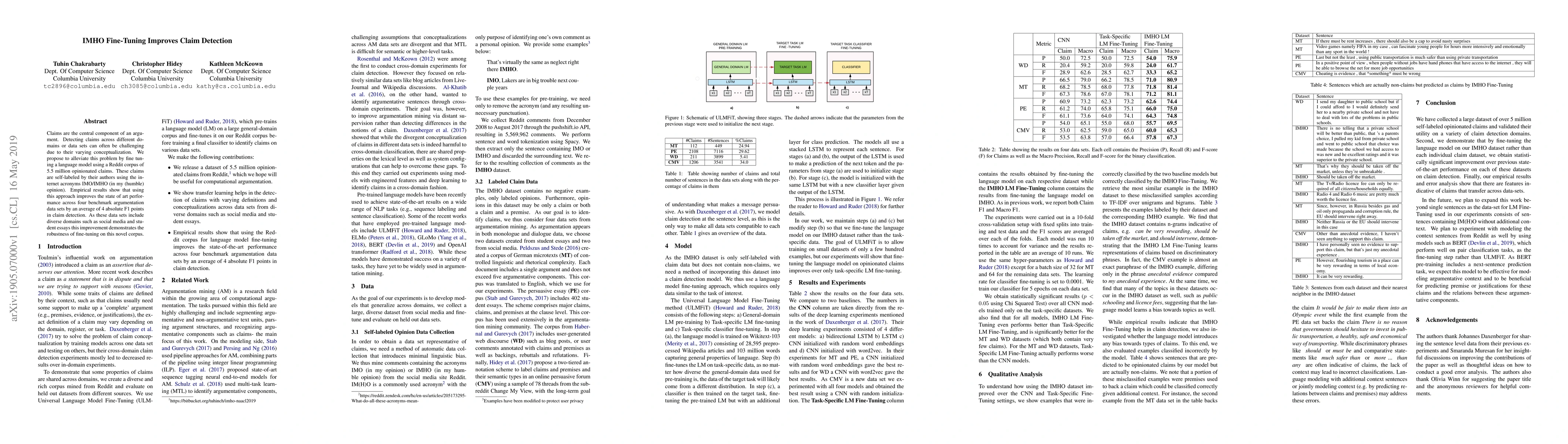 Claims are the central component of an argument. Detecting claims across different domains or data sets can often be challenging due to their varying conceptualization. We propose to alleviate this problem by fine tuning a language model using a Reddit corpus of 5.5 million opinionated claims. These claims are self-labeled by their authors using the internet acronyms IMO/IMHO (in my (humble) opinion). Empirical results show that using this approach improves the state of art performance across four benchmark argumentation data sets by an average of 4 absolute F1 points in claim detection. As these data sets include diverse domains such as social media and student essays this improvement demonstrates the robustness of fine-tuning on this novel corpus.