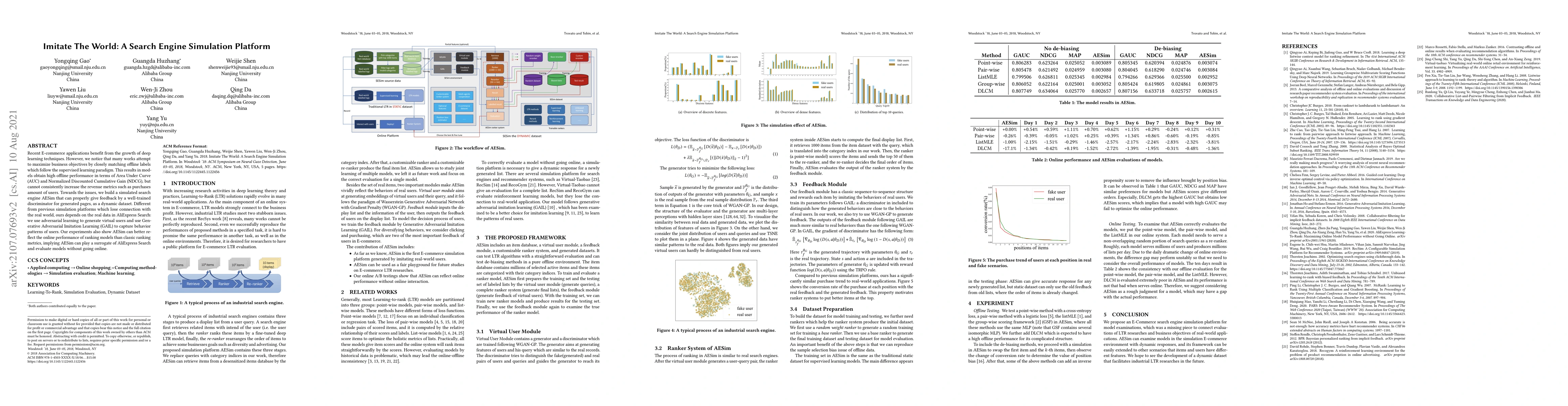 Recent E-commerce applications benefit from the growth of deep learning techniques. However, we notice that many works attempt to maximize business objectives by closely matching offline labels which follow the supervised learning paradigm. This results in models obtain high offline performance in terms of Area Under Curve (AUC) and Normalized Discounted Cumulative Gain (NDCG), but cannot consistently increase the revenue metrics such as purchases amount of users. Towards the issues, we build a simulated search engine AESim that can properly give feedback by a well-trained discriminator for generated pages, as a dynamic dataset. Different from previous simulation platforms which lose connection with the real world, ours depends on the real data in AliExpress Search: we use adversarial learning to generate virtual users and use Generative Adversarial Imitation Learning (GAIL) to capture behavior patterns of users. Our experiments also show AESim can better reflect the online performance of ranking models than classic ranking metrics, implying AESim can play a surrogate of AliExpress Search and evaluate models without going online.