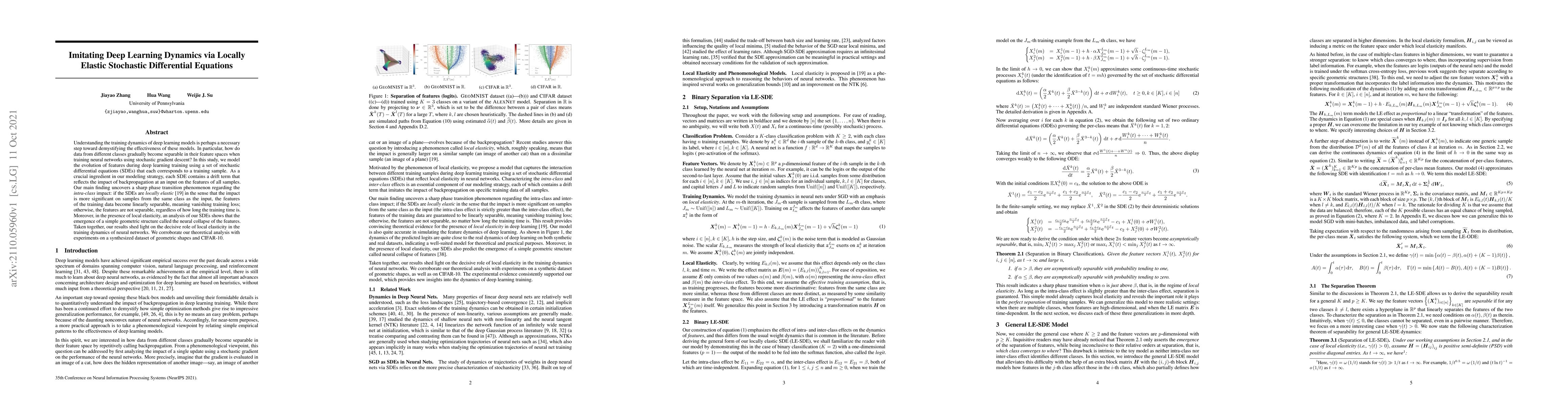 This research models deep learning training dynamics using stochastic differential equations (SDEs) for each training sample, with a drift term reflecting backpropagation impact. It discovers a phase transition where local elasticity (stronger intra-class impact) leads to linearly separable features and vanishing training loss, while non-elasticity results in non-separable features. The study also identifies a neural collapse of features' geometric structure, highlighting local elasticity's crucial role in neural network training. Findings are validated through experiments on synthetic geometric shapes and CIFAR-10 datasets.