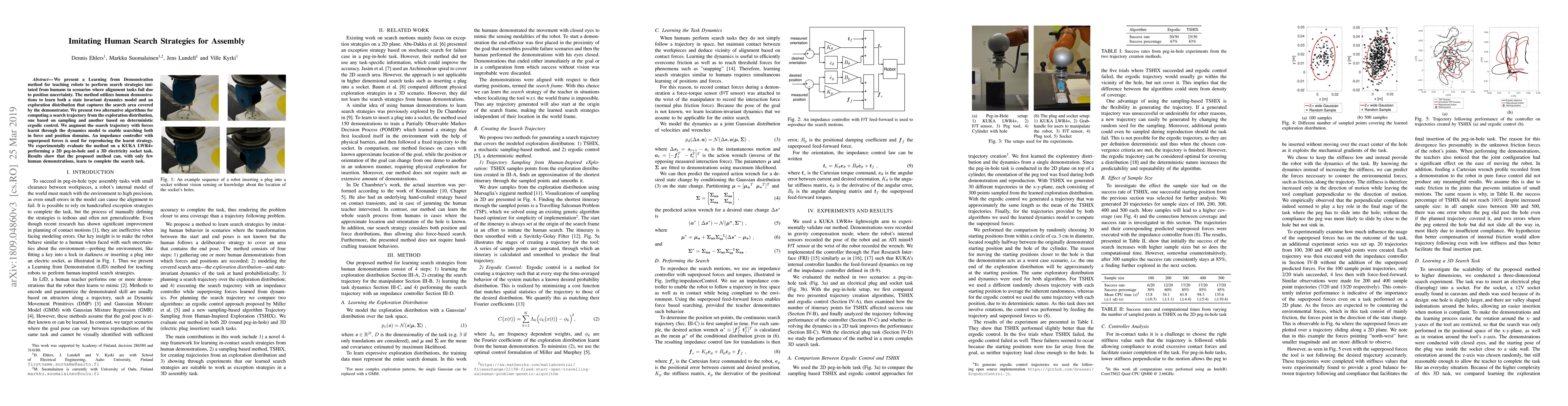 We present a Learning from Demonstration method for teaching robots to perform search strategies imitated from humans in scenarios where alignment tasks fail due to position uncertainty. The method utilizes human demonstrations to learn both a state invariant dynamics model and an exploration distribution that captures the search area covered by the demonstrator. We present two alternative algorithms for computing a search trajectory from the exploration distribution, one based on sampling and another based on deterministic ergodic control. We augment the search trajectory with forces learnt through the dynamics model to enable searching both in force and position domains. An impedance controller with superposed forces is used for reproducing the learnt strategy. We experimentally evaluate the method on a KUKA LWR4+ performing a 2D peg-in-hole and a 3D electricity socket task. Results show that the proposed method can, with only few human demonstrations, learn to complete the search task.