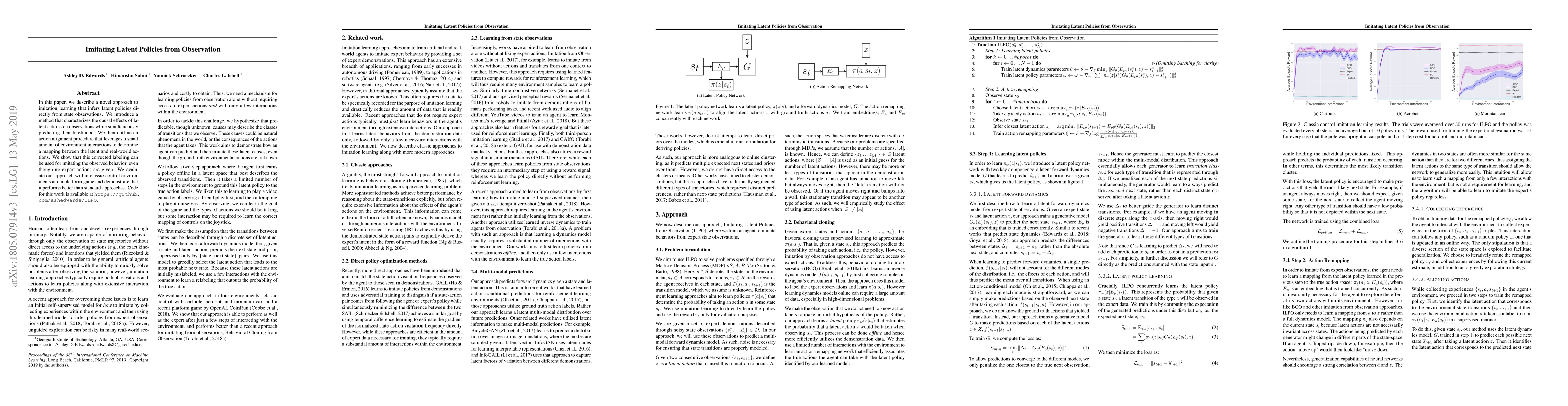 In this paper, we describe a novel approach to imitation learning that infers latent policies directly from state observations. We introduce a method that characterizes the causal effects of latent actions on observations while simultaneously predicting their likelihood. We then outline an action alignment procedure that leverages a small amount of environment interactions to determine a mapping between the latent and real-world actions. We show that this corrected labeling can be used for imitating the observed behavior, even though no expert actions are given. We evaluate our approach within classic control environments and a platform game and demonstrate that it performs better than standard approaches. Code for this work is available at https://github.com/ashedwards/ILPO.