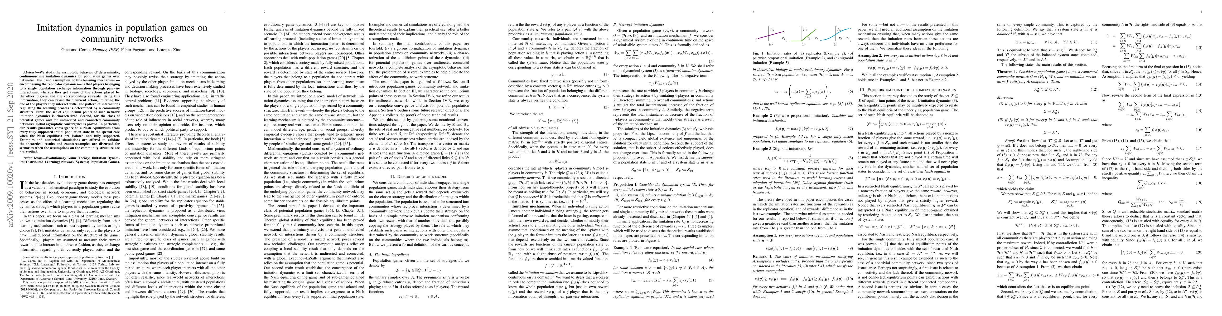 This research paper investigates how imitation dynamics on community networks affect population games, showing global asymptotic convergence to Nash equilibrium in undirected and connected networks. It also provides examples and counterexamples for scenarios with different community structures.