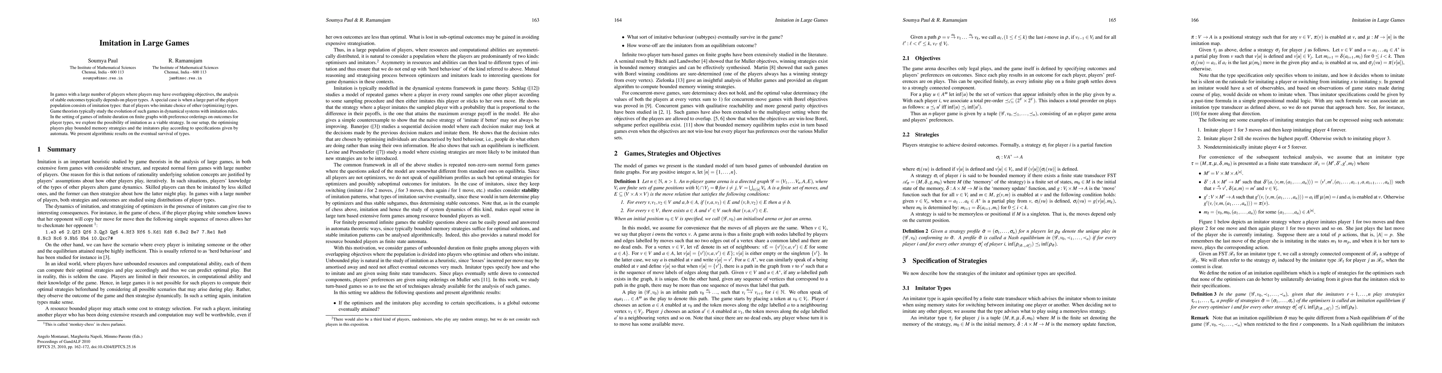 This paper examines stable outcomes in large games with many players, focusing on imitation strategies where a significant portion of players mimic the choices of optimizing players. The study explores the survival of player types in games of infinite duration on finite graphs, using automata to model imitators and bounded memory strategies for optimizers.