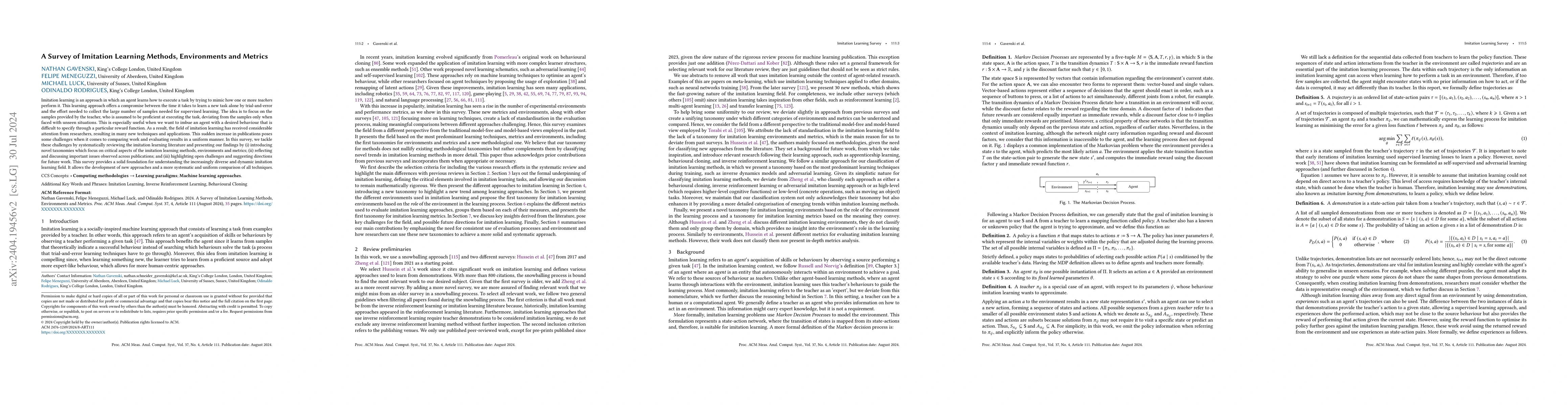 Imitation learning is an approach in which an agent learns how to execute a task by trying to mimic how one or more teachers perform it. This learning approach offers a compromise between the time it takes to learn a new task and the effort needed to collect teacher samples for the agent. It achieves this by balancing learning from the teacher, who has some information on how to perform the task, and deviating from their examples when necessary, such as states not present in the teacher samples. Consequently, the field of imitation learning has received much attention from researchers in recent years, resulting in many new methods and applications. However, with this increase in published work and past surveys focusing mainly on methodology, a lack of standardisation became more prominent in the field. This non-standardisation is evident in the use of environments, which appear in no more than two works, and evaluation processes, such as qualitative analysis, that have become rare in current literature. In this survey, we systematically review current imitation learning literature and present our findings by (i) classifying imitation learning techniques, environments and metrics by introducing novel taxonomies; (ii) reflecting on main problems from the literature; and (iii) presenting challenges and future directions for researchers.