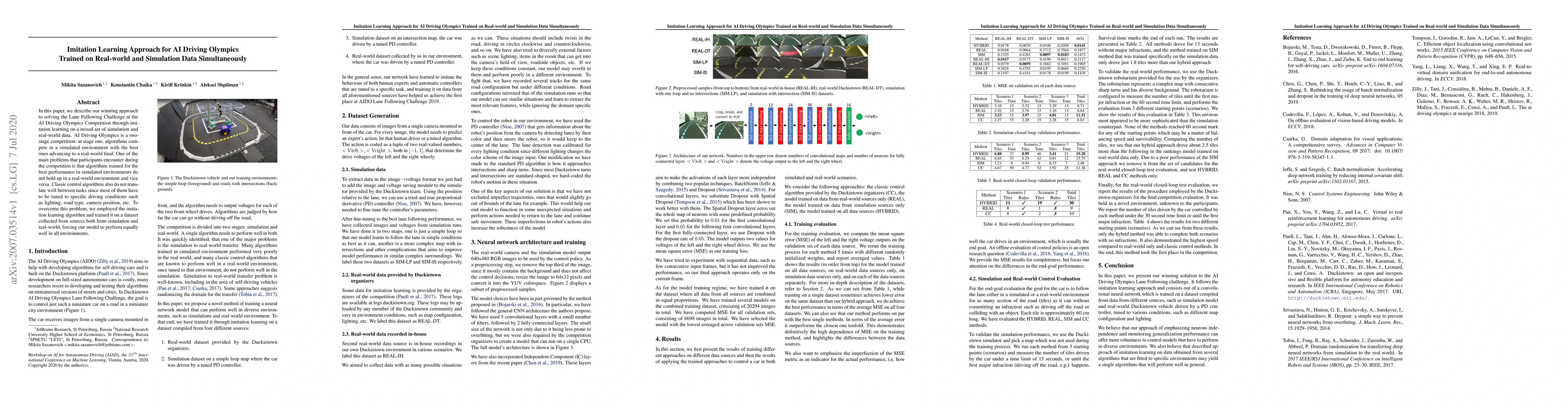 In this paper, we describe our winning approach to solving the Lane Following Challenge at the AI Driving Olympics Competition through imitation learning on a mixed set of simulation and real-world data. AI Driving Olympics is a two-stage competition: at stage one, algorithms compete in a simulated environment with the best ones advancing to a real-world final. One of the main problems that participants encounter during the competition is that algorithms trained for the best performance in simulated environments do not hold up in a real-world environment and vice versa. Classic control algorithms also do not translate well between tasks since most of them have to be tuned to specific driving conditions such as lighting, road type, camera position, etc. To overcome this problem, we employed the imitation learning algorithm and trained it on a dataset collected from sources both from simulation and real-world, forcing our model to perform equally well in all environments.