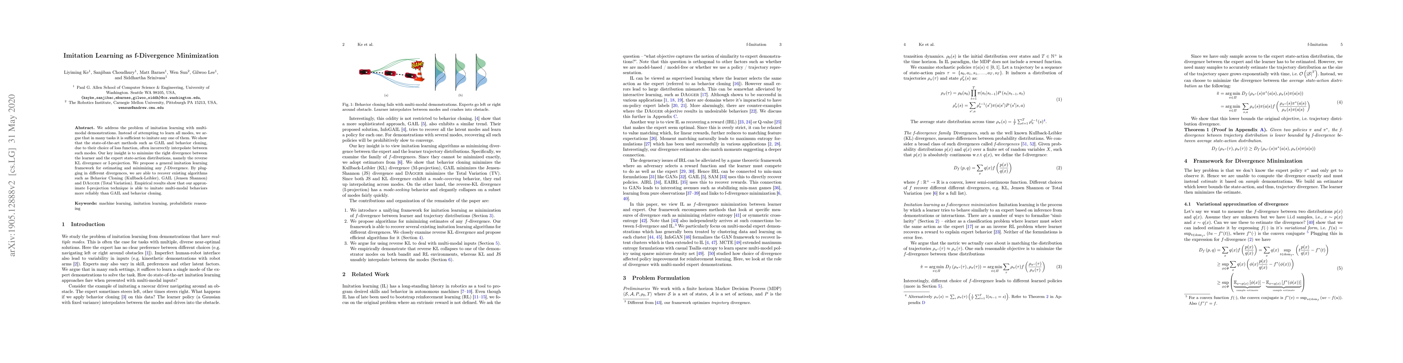 This paper proposes a novel imitation learning framework based on minimizing $f$-divergences, specifically the reverse KL divergence, to more effectively imitate any one of multiple demonstration modes. It demonstrates that existing methods like GAIL and behavior cloning often incorrectly interpolate between modes, leading to improved performance with the proposed I-projection technique.