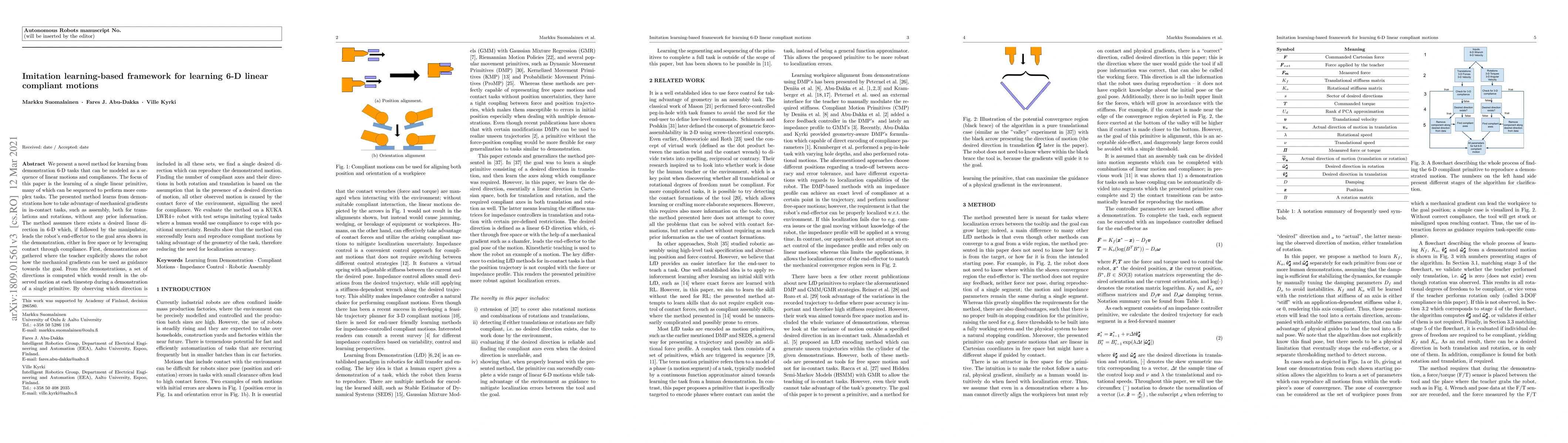 We present a novel method for learning from demonstration 6-D tasks that can be modeled as a sequence of linear motions and compliances. The focus of this paper is the learning of a single linear primitive, many of which can be sequenced to perform more complex tasks. The presented method learns from demonstrations only, without any prior information, how to take advantage of mechanical gradients in in-contact tasks, such as assembly, both for translations and rotations. The method assumes there exists a desired linear direction in 6-D which, if followed by the manipulator, leads the robot's end-effector to the goal area shown in the demonstration, either in free space or by leveraging contact through compliance. First, demonstrations are gathered where the teacher explicitly shows the robot how the mechanical gradients can be used as guidance towards the goal. From the demonstrations, a set of directions is computed which would result in the observed motion at each timestep during a demonstration of a single primitive. By observing which direction is included in all these sets, we find a single desired direction which can reproduce the demonstrated motion. Finding the number of compliant axes and their directions in both rotation and translation is based on the assumption that in the presence of a desired direction of motion, all other observed motion is caused by the contact force of the environment, signalling the need for compliance. We evaluate the method on a KUKA LWR4+ robot with test setups imitating typical tasks where a human would use compliance to cope with positional uncertainty. Results show that the method can successfully learn and reproduce compliant motions by taking advantage of the geometry of the task, therefore reducing the need for localization accuracy.