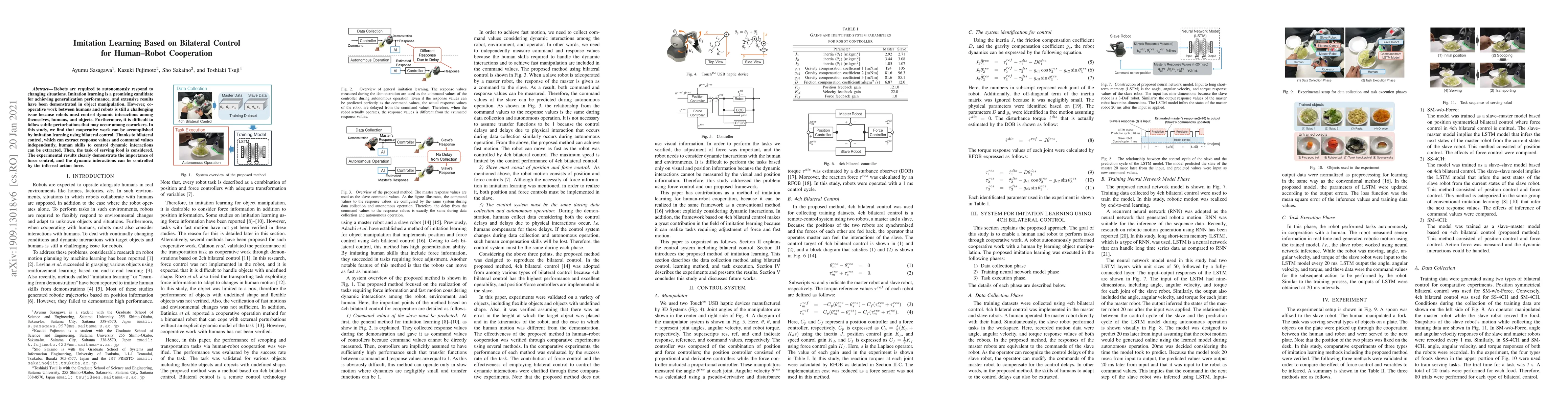 Robots are required to autonomously respond to changing situations. Imitation learning is a promising candidate for achieving generalization performance, and extensive results have been demonstrated in object manipulation. However, cooperative work between humans and robots is still a challenging issue because robots must control dynamic interactions among themselves, humans, and objects. Furthermore, it is difficult to follow subtle perturbations that may occur among coworkers. In this study, we find that cooperative work can be accomplished by imitation learning using bilateral control. Thanks to bilateral control, which can extract response values and command values independently, human skills to control dynamic interactions can be extracted. Then, the task of serving food is considered. The experimental results clearly demonstrate the importance of force control, and the dynamic interactions can be controlled by the inferred action force.
