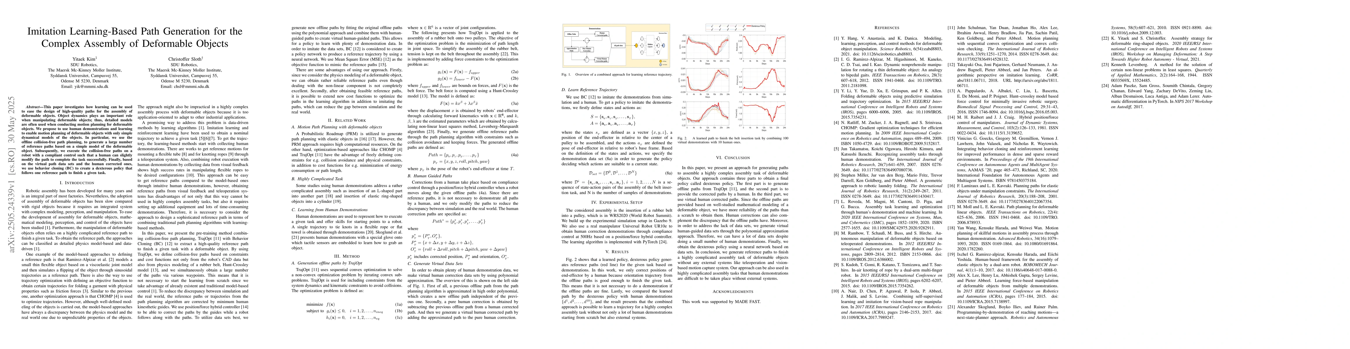 This research introduces a method using human demonstrations and learning to simplify motion planning for assembling deformable objects with basic dynamical models. It involves generating reference paths via offline collision-free planning, executing these on a robot with compliant control for human adjustments, and then training a dexterous policy with behavior cloning to follow reference paths for task completion.