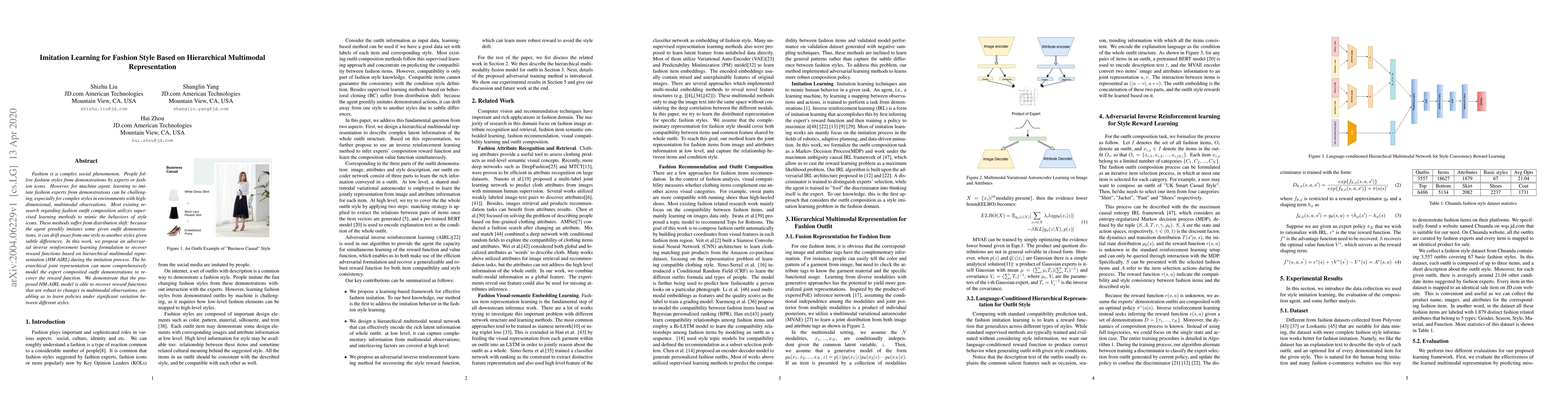 A new method for machine learning fashion style imitation called Hierarchical Multimodal Adversarial Reinforcement Learning (HM-AIRL) is proposed to address distribution shift issues in traditional supervised learning methods. The HM-AIRL model recovers robust reward functions from hierarchical multimodal representations, enabling the learning of policies under varying styles.