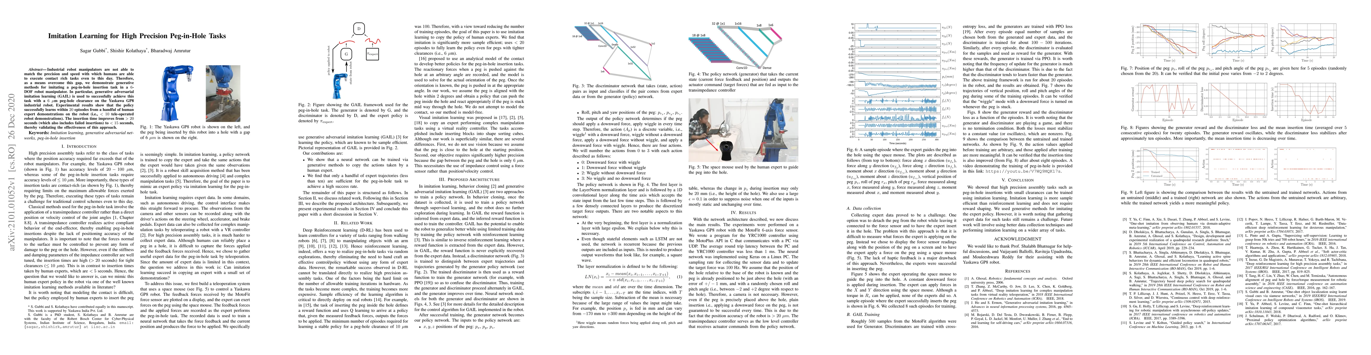 This paper demonstrates the use of generative adversarial imitation learning (GAIL) to teach a 6-DOF robot manipulator to perform high precision peg-in-hole tasks, achieving a 10 µm and 6 µm peg-hole clearance. The method learns effectively from fewer than 10 human demonstrations, reducing insertion time from over 20 seconds to under 15 seconds.