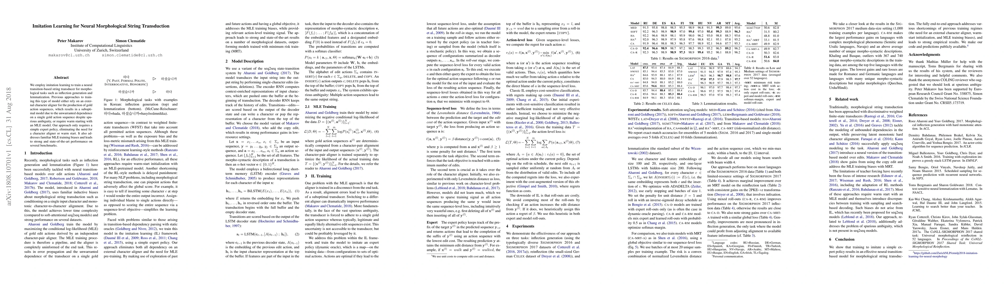 We employ imitation learning to train a neural transition-based string transducer for morphological tasks such as inflection generation and lemmatization. Previous approaches to training this type of model either rely on an external character aligner for the production of gold action sequences, which results in a suboptimal model due to the unwarranted dependence on a single gold action sequence despite spurious ambiguity, or require warm starting with an MLE model. Our approach only requires a simple expert policy, eliminating the need for a character aligner or warm start. It also addresses familiar MLE training biases and leads to strong and state-of-the-art performance on several benchmarks.