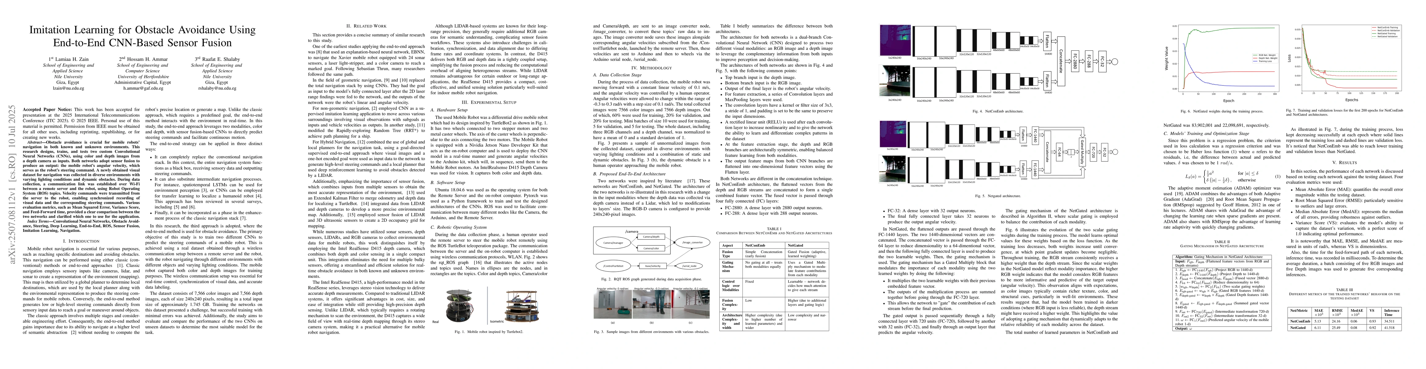 Obstacle avoidance is crucial for mobile robots' navigation in both known and unknown environments. This research designs, trains, and tests two custom Convolutional Neural Networks (CNNs), using color and depth images from a depth camera as inputs. Both networks adopt sensor fusion to produce an output: the mobile robot's angular velocity, which serves as the robot's steering command. A newly obtained visual dataset for navigation was collected in diverse environments with varying lighting conditions and dynamic obstacles. During data collection, a communication link was established over Wi-Fi between a remote server and the robot, using Robot Operating System (ROS) topics. Velocity commands were transmitted from the server to the robot, enabling synchronized recording of visual data and the corresponding steering commands. Various evaluation metrics, such as Mean Squared Error, Variance Score, and Feed-Forward time, provided a clear comparison between the two networks and clarified which one to use for the application.