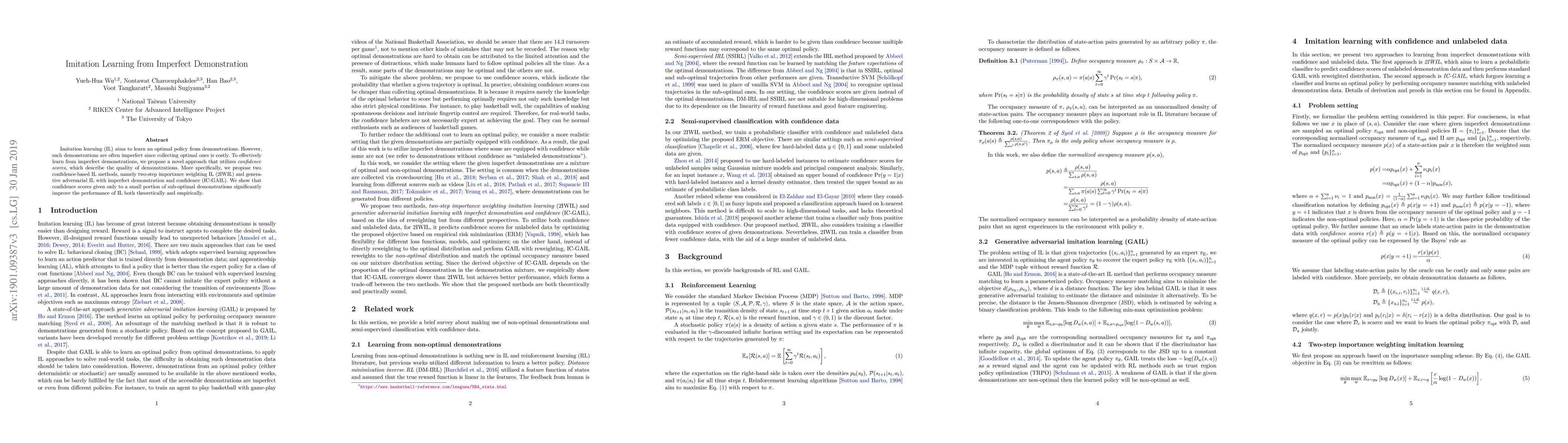 This paper proposes novel imitation learning methods, 2IWIL and IC-GAIL, that leverage confidence scores to improve learning from imperfect demonstrations. These methods significantly enhance performance by weighting sub-optimal demonstrations according to their quality, demonstrating both theoretical and empirical improvements.