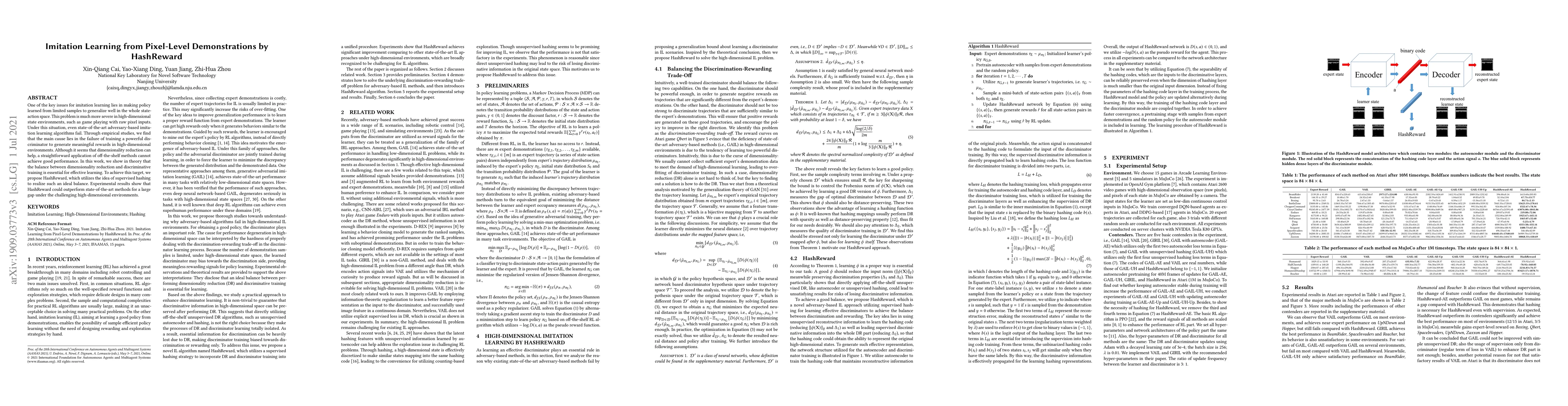 The paper proposes HashReward, an imitation learning method that balances dimensionality reduction and discriminative training to improve generalization in high-dimensional environments like game playing with raw pixel inputs. Experimental results demonstrate that HashReward outperforms state-of-the-art methods in these challenging settings.