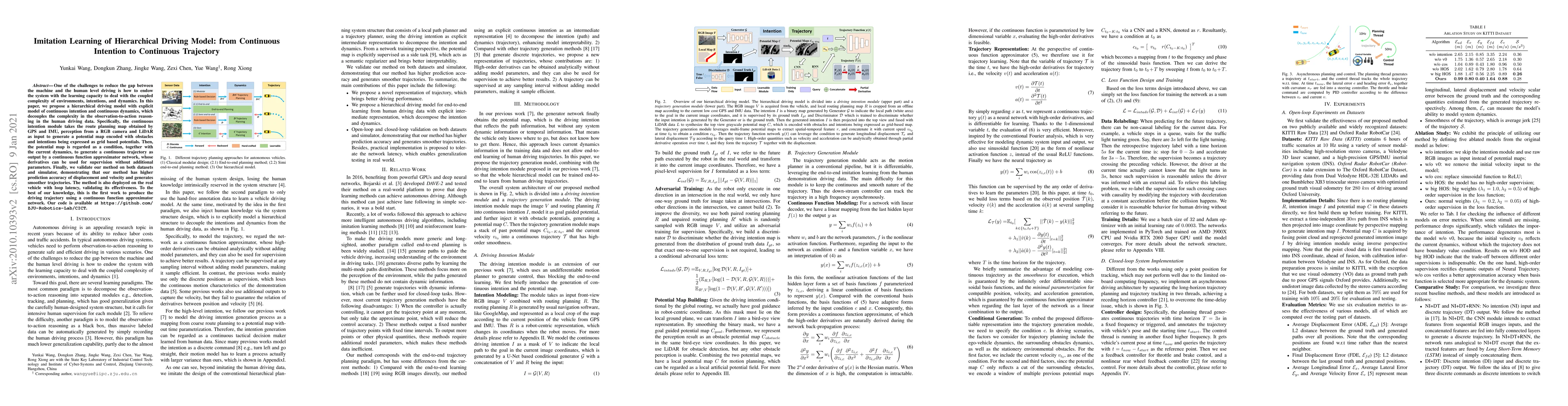 One of the challenges to reduce the gap between the machine and the human level driving is how to endow the system with the learning capacity to deal with the coupled complexity of environments, intentions, and dynamics. In this paper, we propose a hierarchical driving model with explicit model of continuous intention and continuous dynamics, which decouples the complexity in the observation-to-action reasoning in the human driving data. Specifically, the continuous intention module takes the route planning map obtained by GPS and IMU, perception from a RGB camera and LiDAR as input to generate a potential map encoded with obstacles and intentions being expressed as grid based potentials. Then, the potential map is regarded as a condition, together with the current dynamics, to generate a continuous trajectory as output by a continuous function approximator network, whose derivatives can be used for supervision without additional parameters. Finally, we validate our method on both datasets and simulator, demonstrating that our method has higher prediction accuracy of displacement and velocity and generates smoother trajectories. The method is also deployed on the real vehicle with loop latency, validating its effectiveness. To the best of our knowledge, this is the first work to produce the driving trajectory using a continuous function approximator network.