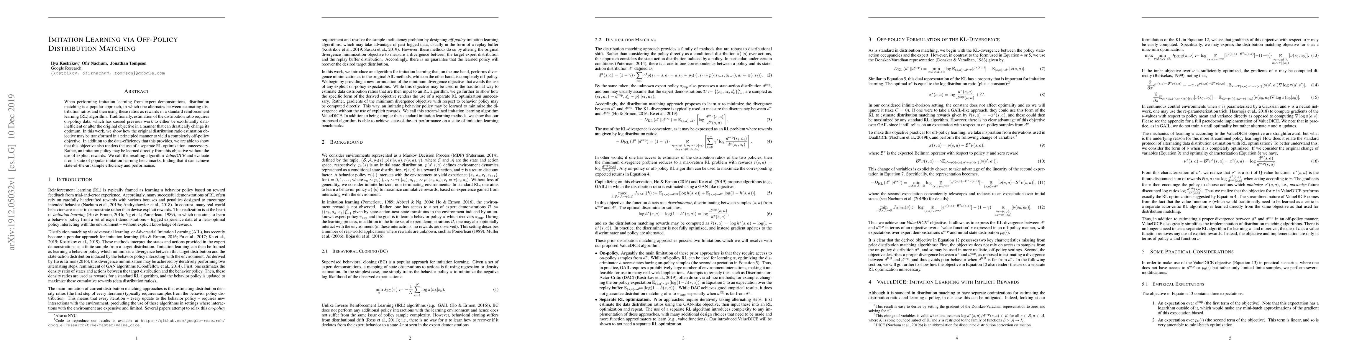 This paper proposes ValueDICE, an imitation learning method that uses off-policy distribution matching to achieve data efficiency without requiring on-policy data. It eliminates the need for separate reinforcement learning optimization, directly learning an imitation policy from the off-policy objective, achieving state-of-the-art sample efficiency and performance on benchmarks.
