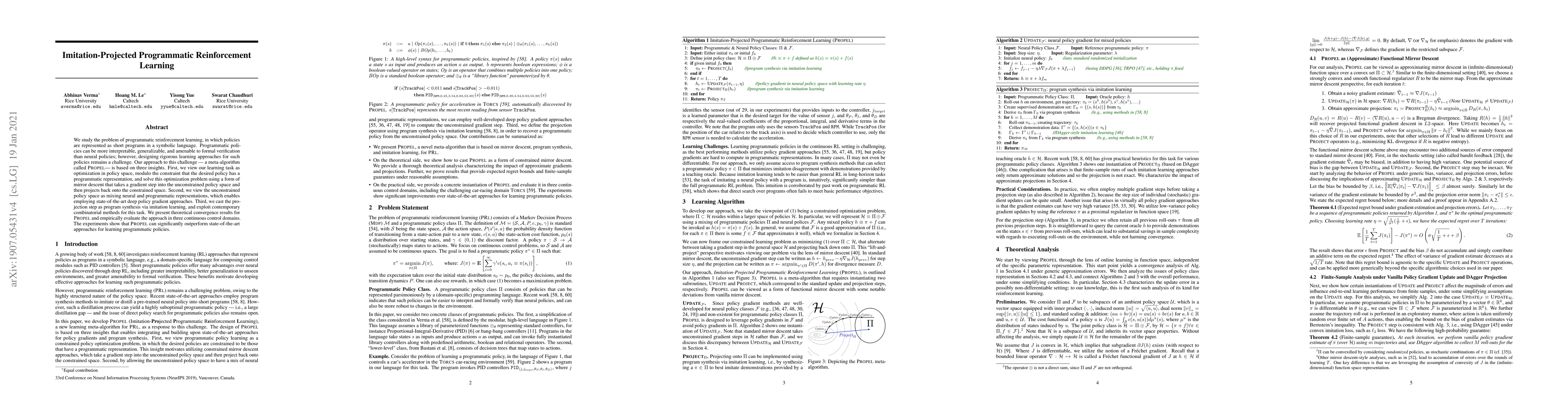 This paper introduces PROPEL, a meta-algorithm for programmatic reinforcement learning, which optimizes interpretable policies using mirror descent and combines neural and programmatic representations. The approach projects results back into the programmatic space through imitation learning, achieving superior performance in continuous control tasks compared to existing methods.