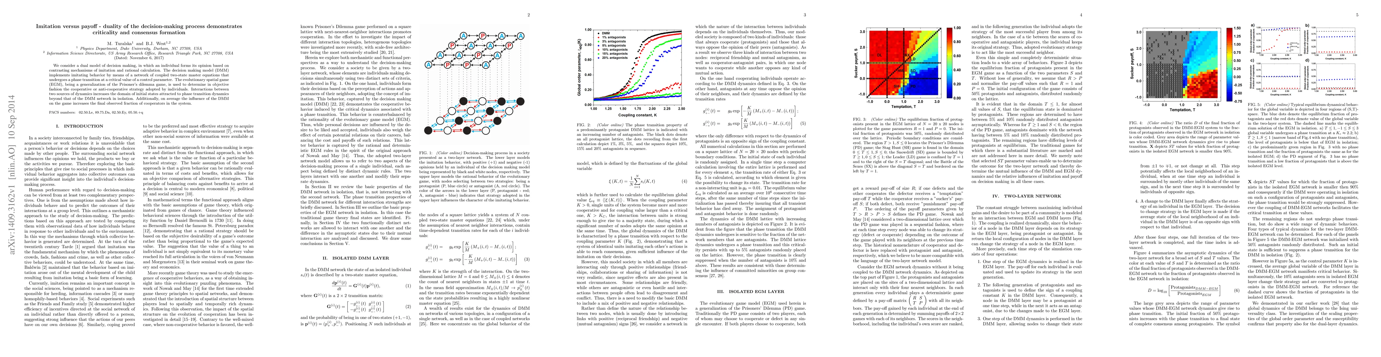 We consider a dual model of decision making, in which an individual forms its opinion based on contrasting mechanisms of imitation and rational calculation. The decision making model (DMM) implements imitating behavior by means of a network of coupled two-state master equations that undergoes a phase transition at a critical value of a control parameter. The evolutionary spatial game (EGM), being a generalization of the Prisoner's dilemma game, is used to determine in objective fashion the cooperative or anti-cooperative strategy adopted by individuals. Interactions between two sources of dynamics increases the domain of initial states attracted to phase transition dynamics beyond that of the DMM network in isolation. Additionally, on average the influence of the DMM on the game increases the final observed fraction of cooperators in the system.