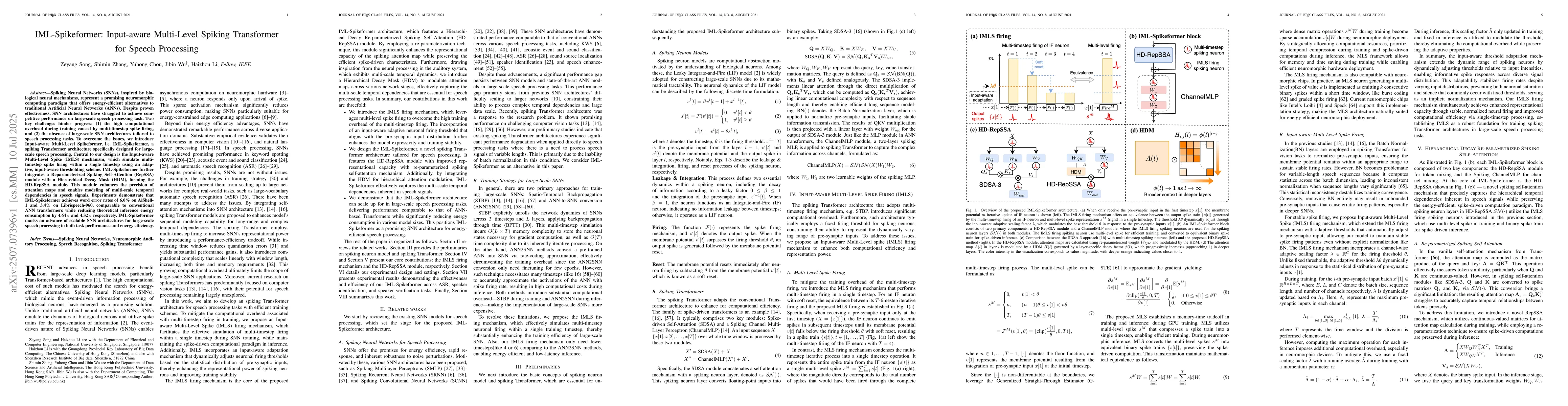 Spiking Neural Networks (SNNs), inspired by biological neural mechanisms, represent a promising neuromorphic computing paradigm that offers energy-efficient alternatives to traditional Artificial Neural Networks (ANNs). Despite proven effectiveness, SNN architectures have struggled to achieve competitive performance on large-scale speech processing task. Two key challenges hinder progress: (1) the high computational overhead during training caused by multi-timestep spike firing, and (2) the absence of large-scale SNN architectures tailored to speech processing tasks. To overcome the issues, we introduce Input-aware Multi-Level Spikeformer, i.e. IML-Spikeformer, a spiking Transformer architecture specifically designed for large-scale speech processing. Central to our design is the Input-aware Multi-Level Spike (IMLS) mechanism, which simulate multi-timestep spike firing within a single timestep using an adaptive, input-aware thresholding scheme. IML-Spikeformer further integrates a Reparameterized Spiking Self-Attention (RepSSA) module with a Hierarchical Decay Mask (HDM), forming the HD-RepSSA module. This module enhances the precision of attention maps and enables modeling of multi-scale temporal dependencies in speech signals. Experiments demonstrate that IML-Spikeformer achieves word error rates of 6.0\% on AiShell-1 and 3.4\% on Librispeech-960, comparable to conventional ANN transformers while reducing theoretical inference energy consumption by 4.64$\times$ and 4.32$\times$ respectively. IML-Spikeformer marks an advance of scalable SNN architectures for large-scale speech processing in both task performance and energy efficiency.