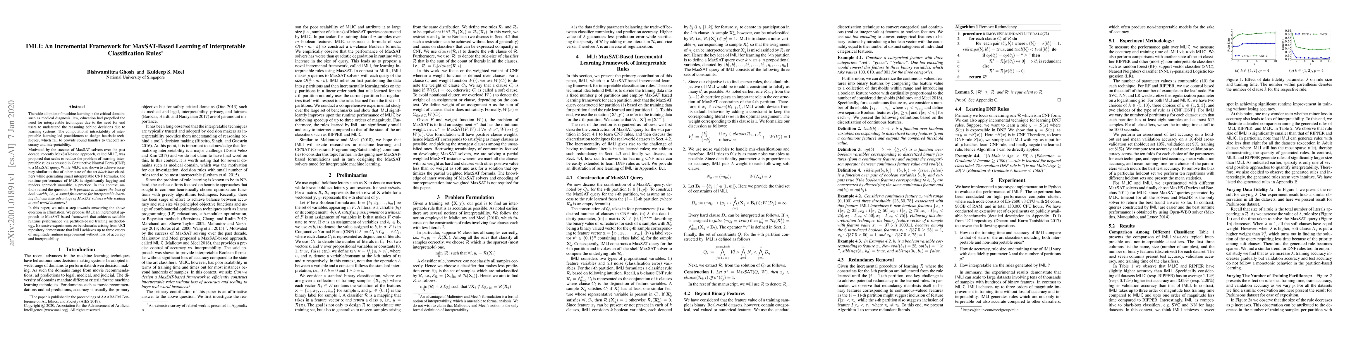 This paper introduces IMLI, an incremental framework for MaxSAT-based learning of interpretable classification rules, aiming to improve scalability while maintaining accuracy and interpretability. Experiments show significant runtime improvements up to three orders of magnitude on UCI benchmarks.