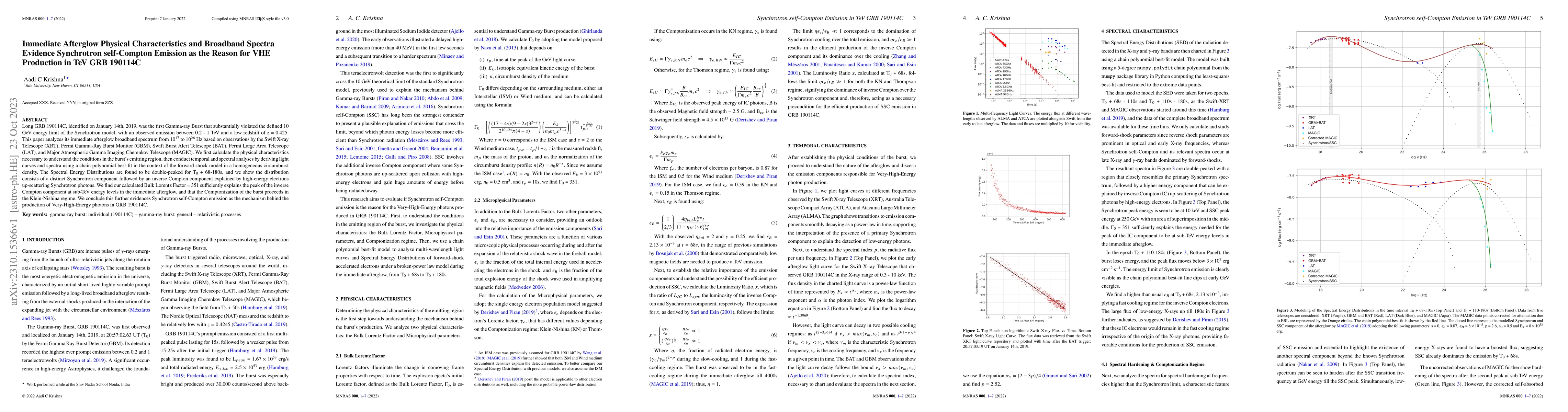 Long GRB 190114C, identified on January 14th, 2019, was the first Gamma-ray Burst that substantially violated the defined 10 GeV energy limit of the Synchrotron model, with an observed emission between 0.2 - 1 TeV and a low redshift of z = 0.425. This paper analyzes its immediate afterglow broadband spectrum from 10$^{17}$ to 10$^{26}$ Hz based on observations by the Swift X-ray Telescope (XRT), Fermi Gamma-Ray Burst Monitor (GBM), Swift Burst Alert Telescope (BAT), Fermi Large Area Telescope (LAT), and Major Atmospheric Gamma Imaging Cherenkov Telescope (MAGIC). We first calculate the physical characteristics necessary to understand the conditions in the burst's emitting region, then conduct temporal and spectral analyses by deriving light curves and spectra using a chain polynomial best-fit in the context of the forward shock model in a homogeneous circumburst density. The Spectral Energy Distributions are found to be double-peaked for T$_0$ + 68-180s, and we show the distribution consists of a distinct Synchrotron component followed by an inverse Compton component explained by high-energy electrons up-scattering Synchrotron photons. We find our calculated Bulk Lorentz Factor = 351 sufficiently explains the peak of the inverse Compton component at sub-TeV energy levels in the immediate afterglow, and that the Comptonization of the burst proceeds in the Klein-Nishina regime. We conclude this further evidences Synchrotron self-Compton emission as the mechanism behind the production of Very-High-Energy photons in GRB 190114C.