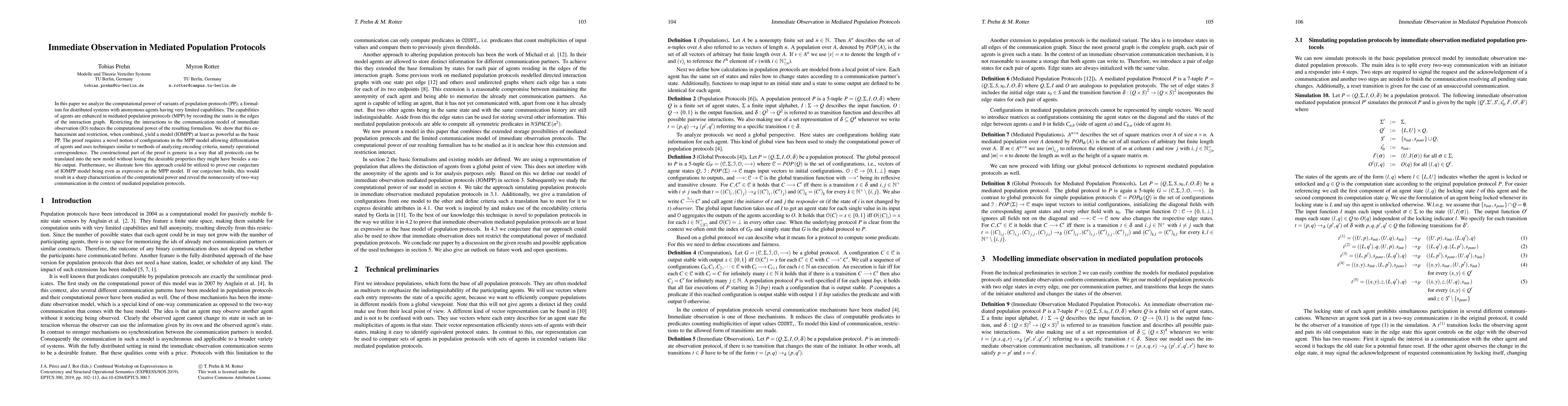 The paper introduces a novel notion of configurations in mediated population protocols and proves that immediate observation mediated population protocols (IOMPP) are at least as powerful as basic population protocols (PP).