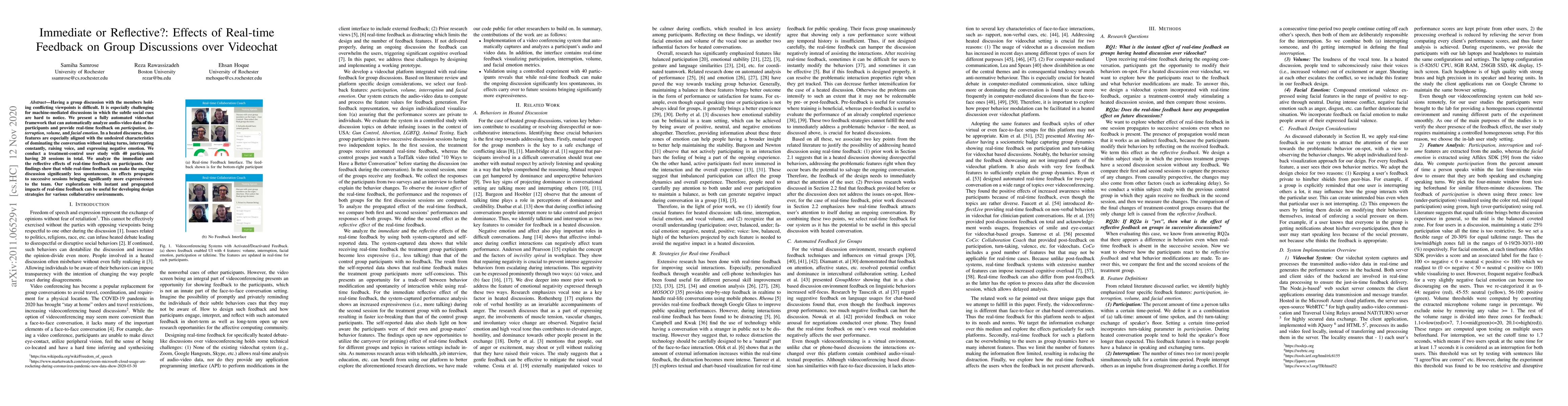 Having a group discussion with the members holding conflicting viewpoints is difficult. It is especially challenging for machine-mediated discussions in which the subtle social cues are hard to notice. We present a fully automated videochat framework that can automatically analyze audio-video data of the participants and provide real-time feedback on participation, interruption, volume, and facial emotion. In a heated discourse, these features are especially aligned with the undesired characteristics of dominating the conversation without taking turns, interrupting constantly, raising voice, and expressing negative emotion. We conduct a treatment-control user study with 40 participants having 20 sessions in total. We analyze the immediate and the reflective effects of real-time feedback on participants. Our findings show that while real-time feedback can make the ongoing discussion significantly less spontaneous, its effects propagate to successive sessions bringing significantly more expressiveness to the team. Our explorations with instant and propagated impacts of real-time feedback can be useful for developing design strategies for various collaborative environments.