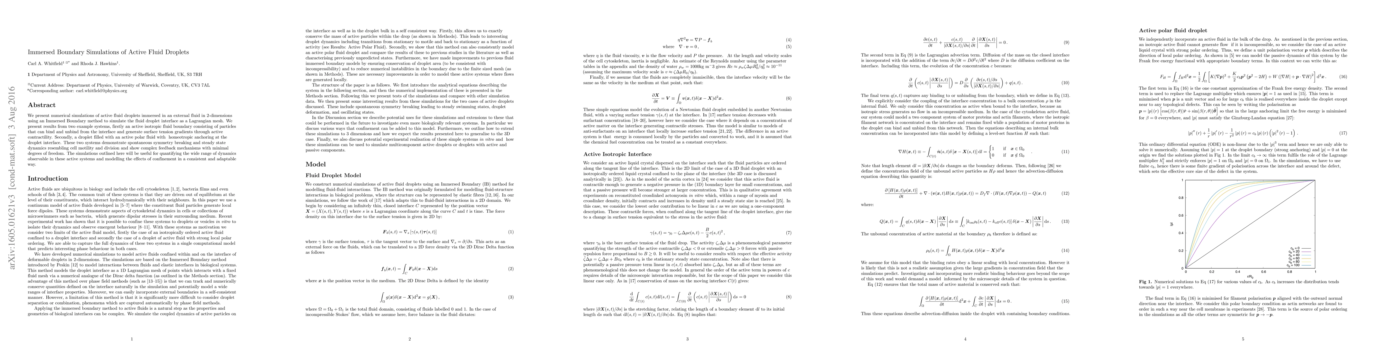 We present numerical simulations of active fluid droplets immersed in an external fluid in 2-dimensions { using} an Immersed Boundary method to simulate the fluid droplet interface as a Lagrangian mesh. We present results from two example systems, firstly an active isotropic fluid boundary consisting of particles that can bind and unbind from the interface and generate surface tension gradients through active contractility. Secondly, a droplet filled with an active polar fluid with { homeotropic} anchoring at the droplet interface. These two systems demonstrate spontaneous symmetry breaking and steady state dynamics resembling cell motility and division and show complex feedback mechanisms with minimal degrees of freedom. The simulations outlined here will be useful for quantifying the wide range of dynamics observable in these active systems and modelling the effects of confinement in a consistent and adaptable way.
