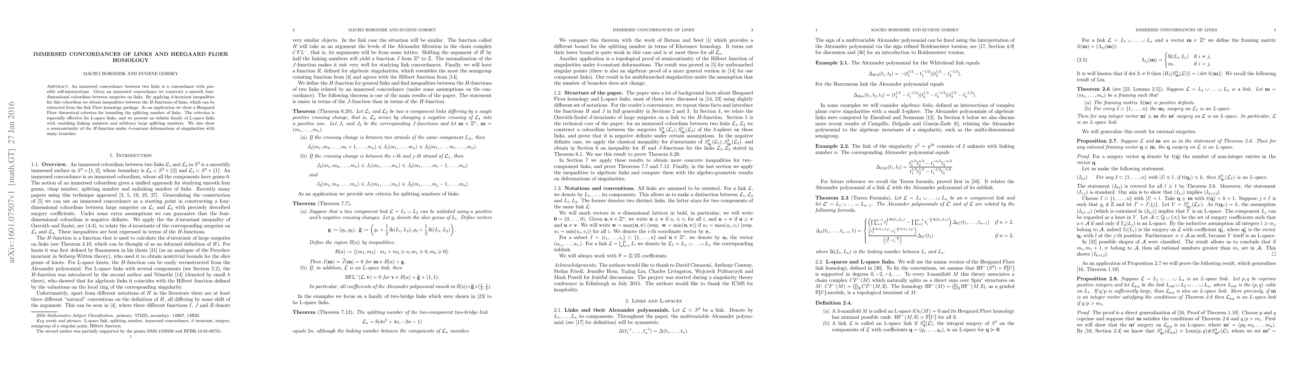 An immersed concordance between two links is a concordance with possible self-intersections. Given an immersed concordance we construct a smooth four-dimensional cobordism between surgeries on links. By applying $d$-invariant inequalities for this cobordism we obtain inequalities between the $H$-functions of links, which can be extracted from the link Floer homology package. As an application we show a Heegaard Floer theoretical criterion for bounding the splitting number of links. The criterion is especially effective for L-space links, and we present an infinite family of L-space links with vanishing linking numbers and arbitrary large splitting numbers. We also show a semicontinuity of the $H$-function under $\delta$-constant deformations of singularities with many branches.