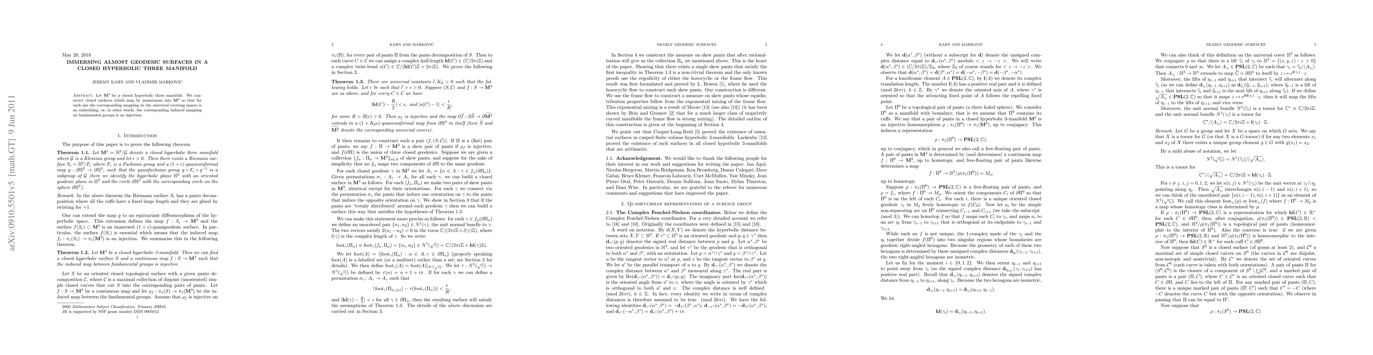 This paper constructs closed surfaces that immerse into a closed hyperbolic three-manifold M, with mappings on universal covering spaces that are embeddings, indicating injective mappings on fundamental groups. The work explores the geometric and topological properties of such surfaces within hyperbolic three-manifolds.