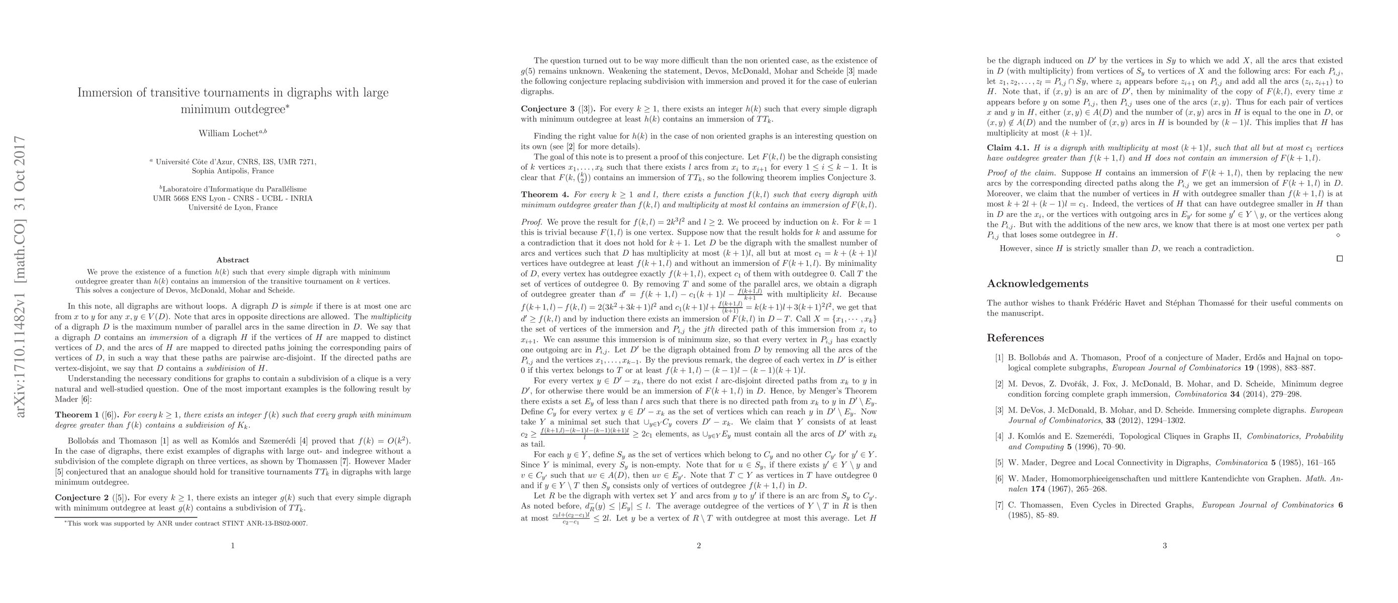 Summary: The paper establishes a function $h(k)$ ensuring that any digraph with a minimum outdegree exceeding $h(k)$ contains an immersion of a transitive tournament on $k$ vertices, thereby resolving a conjecture by Devos, McDonald, Mohar, and Scheide.