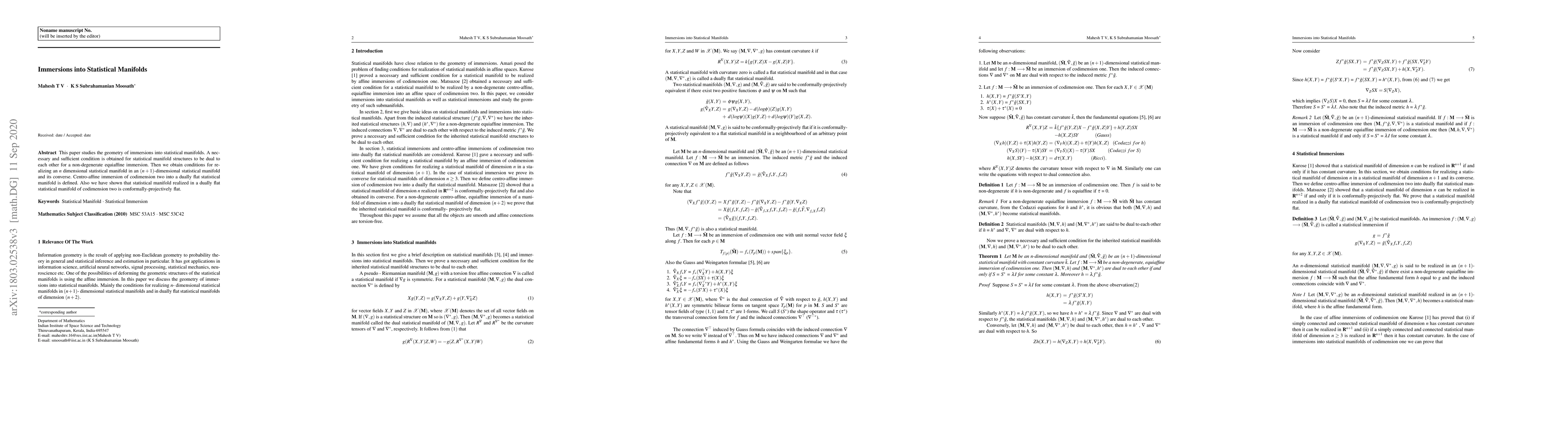 This paper explores the geometry of immersions into statistical manifolds, establishing conditions for dual statistical manifold structures and realizing n-dimensional manifolds in (n+1)-dimensional counterparts. It also defines centro-affine immersions and proves conformal-projectively flat properties for dually flat statistical manifolds of codimension two.
