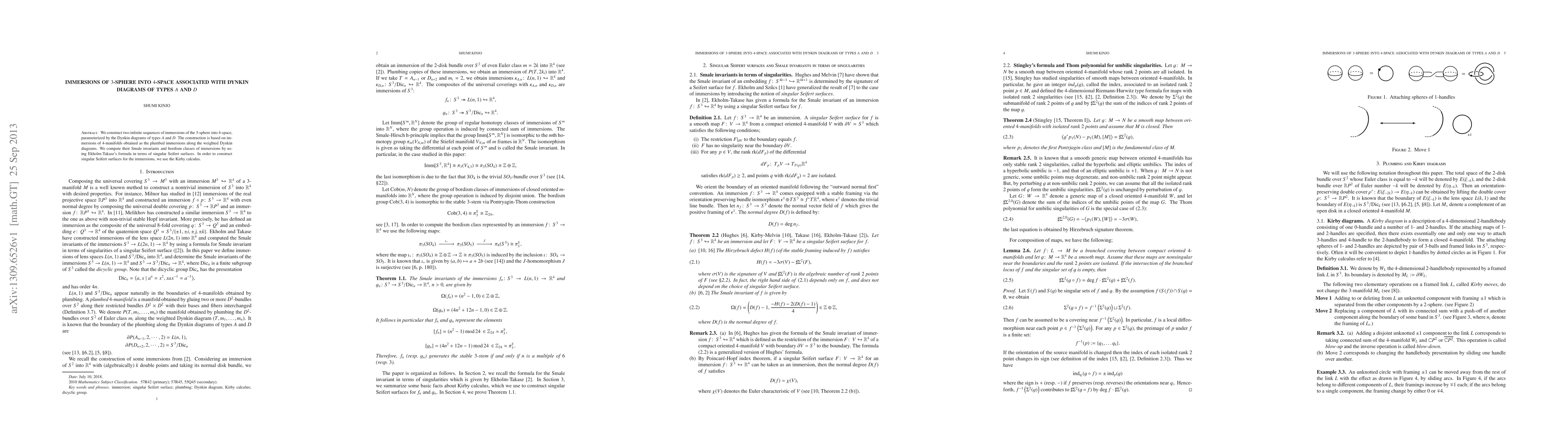 This paper constructs infinite sequences of 3-sphere immersions into 4-space using Dynkin diagrams of types A and D, calculating Smale invariants and bordism classes through the use of singular Seifert surfaces.