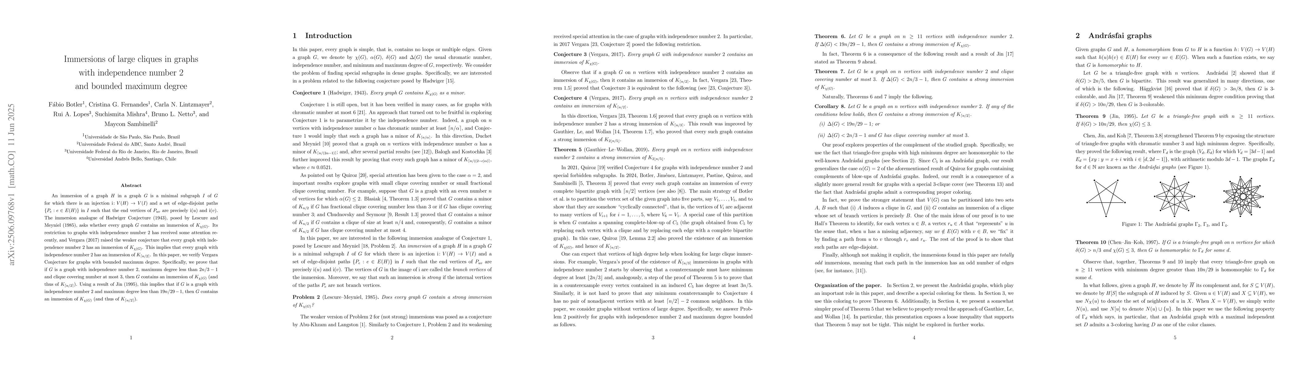 This research paper verifies Vergara's conjecture for graphs with independence number 2, maximum degree less than 2n/3 - 1, and clique covering number at most 3, proving they contain an immersion of $K_{ ext{chromatic number}}$ or $K_{ ext{ceiling}(n/2)}$.