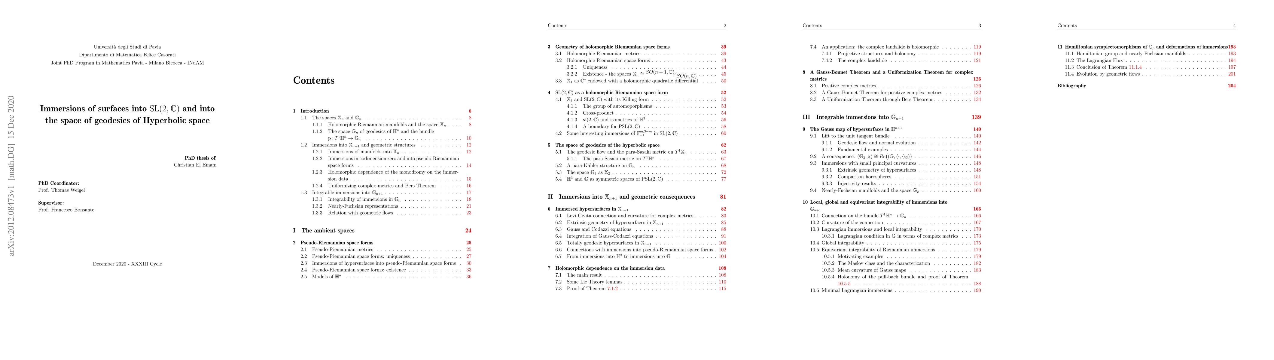 This thesis mainly treats two developments of the classical theory of hypersurfaces inside pseudo-Riemannian space forms. The former - a joint work with Francesco Bonsante - consists in the study of immersions of smooth manifolds into holomorphic Riemannian space forms of constant curvature -1 (including SL(2,C) with a multiple of its Killing form): this leads to a Gauss-Codazzi theorem, it suggests an approach to holomorphic transitioning of immersions into pseudo-Riemannian space forms, a trick to construct holomorphic maps into the PSL(2,C)-character variety, and leads to a restatement of Bers theorem. The latter - a joint work with Andrea Seppi - consists in the study of immersions of n-manifolds inside the space of geodesics of the hyperbolic (n+1)-space. We give a characterization, in terms of the para-Sasaki structure of this space of geodesics, of the Riemannian immersions which turn out to be Gauss maps of equivariant immersions into the hyperbolic space.