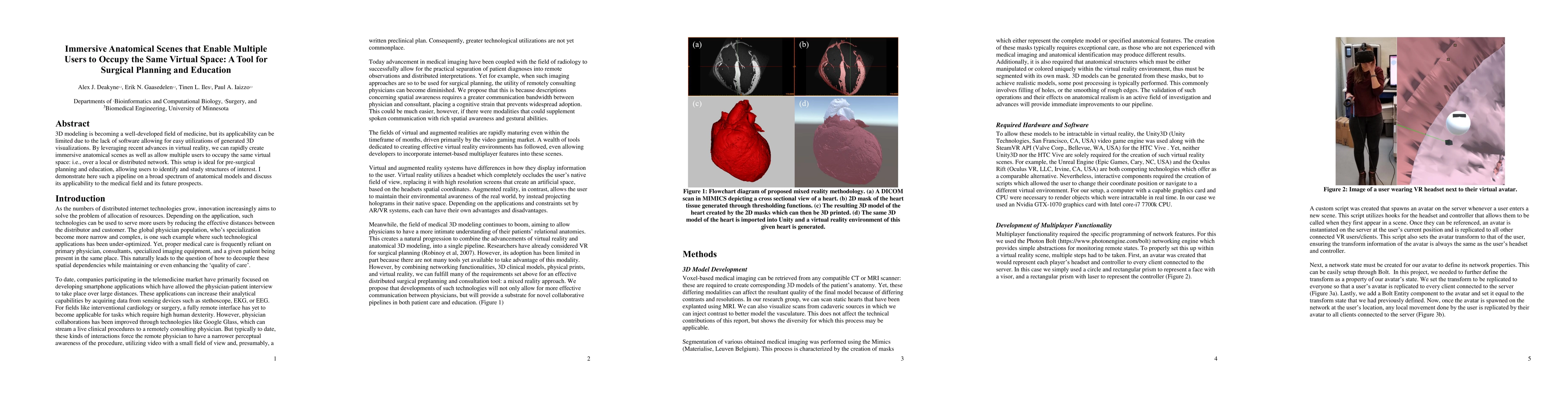 3D modeling is becoming a well-developed field of medicine, but its applicability can be limited due to the lack of software allowing for easy utilizations of generated 3D visualizations. By leveraging recent advances in virtual reality, we can rapidly create immersive anatomical scenes as well as allow multiple users to occupy the same virtual space: i.e., over a local or distributed network. This setup is ideal for pre-surgical planning and education, allowing users to identify and study structures of interest. I demonstrate here such a pipeline on a broad spectrum of anatomical models and discuss its applicability to the medical field and its future prospects.3D modeling is becoming a well-developed field of medicine, but its applicability can be limited due to the lack of software allowing for easy utilizations of generated 3D visualizations. By leveraging recent advances in virtual reality, we can rapidly create immersive anatomical scenes as well as allow multiple users to occupy the same virtual space: i.e., over a local or distributed network. This setup is ideal for pre-surgical planning and education, allowing users to identify and study structures of interest. I demonstrate here such a pipeline on a broad spectrum of anatomical models and discuss its applicability to the medical field and its future prospects.